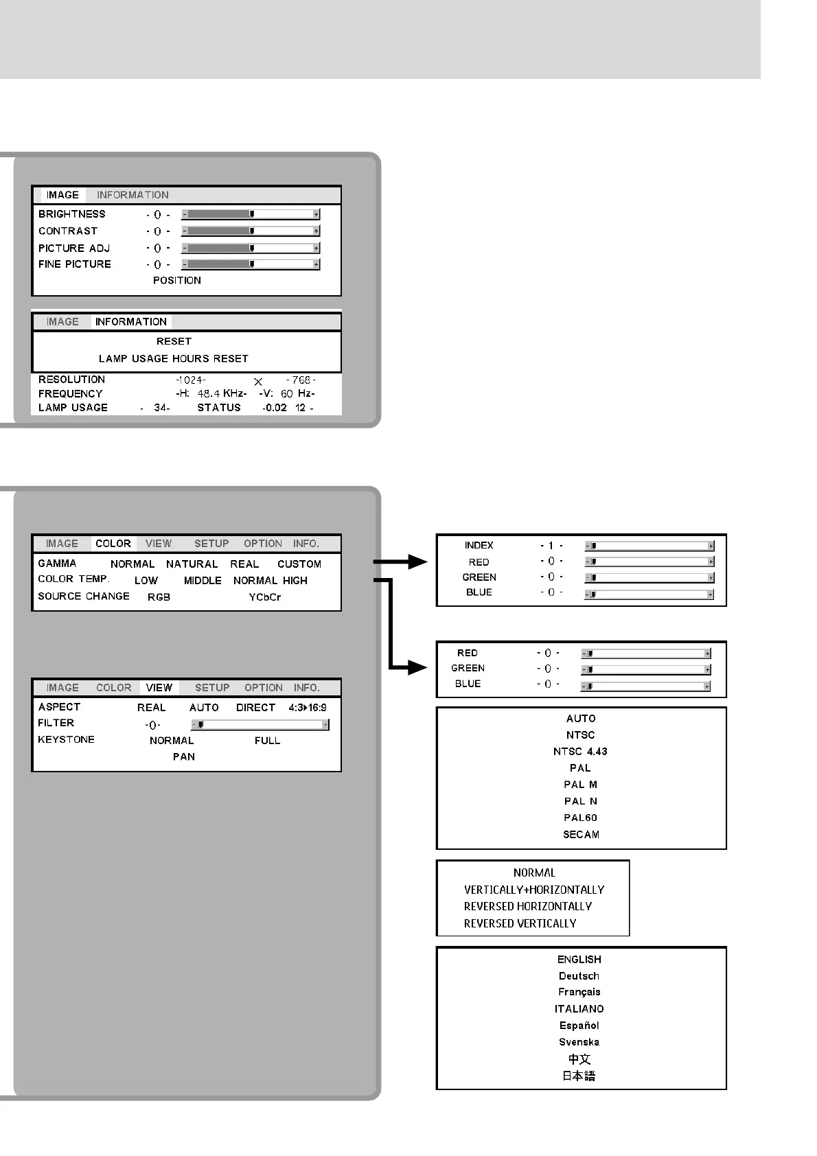 Plus U3 - Menu Settings for RGB Input Sources; Normal Menu Picture Adjustments; Advanced Menu Configuration Options