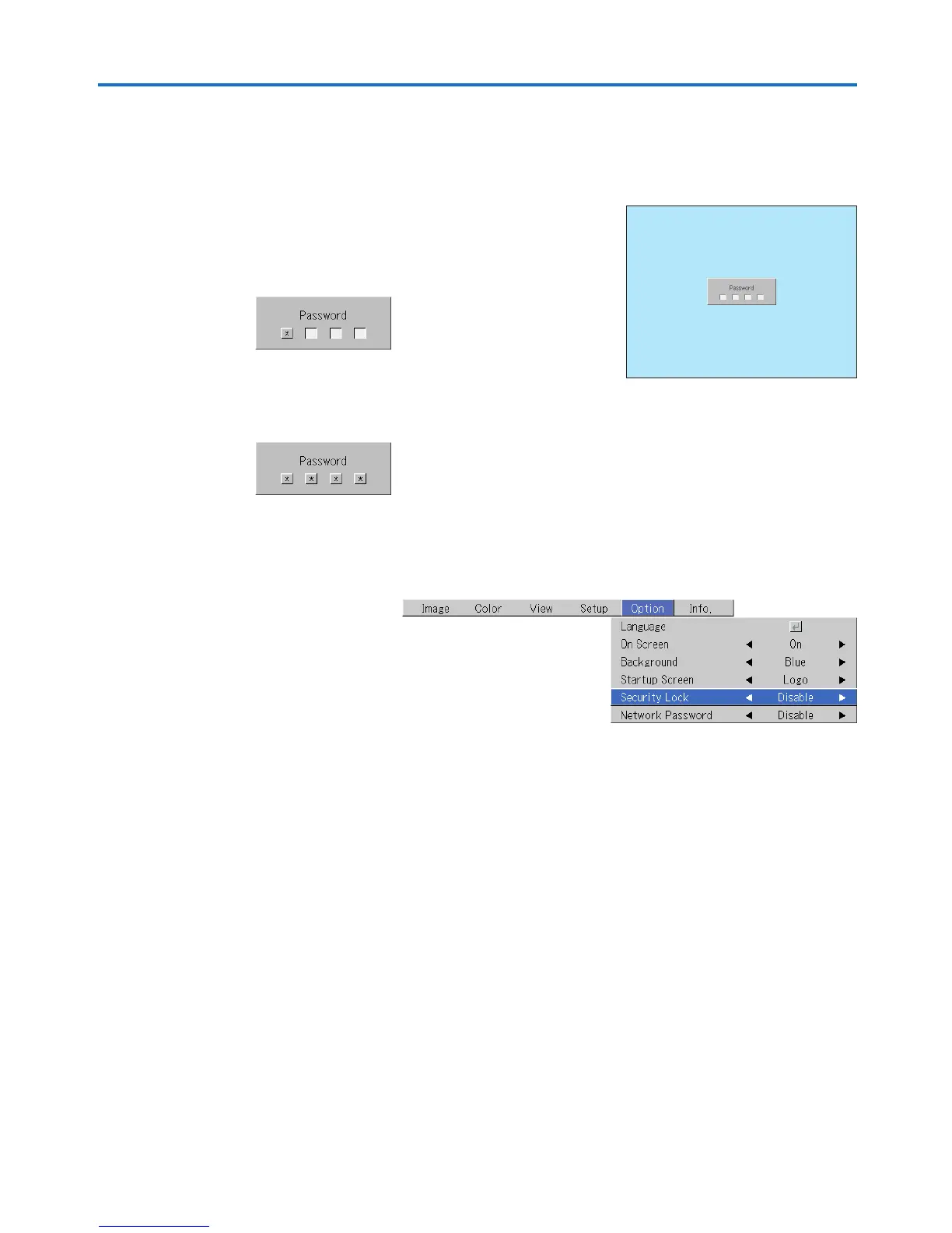 When a password has been registered, the “Password” input window appears on the projected image when the power is turned
