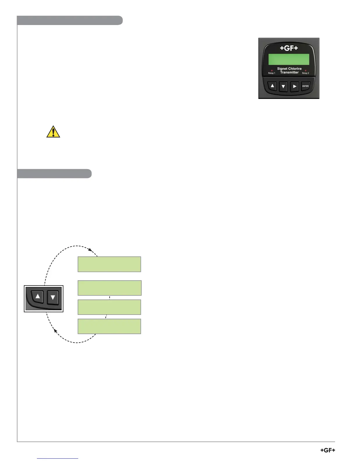 • When editing the CALIBRATE or OPTIONS menus, the transmitter will return to the default display after 10 minutes and then