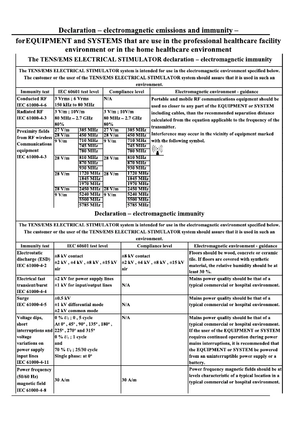 Plusmed pM-TE01 - Electromagnetic Emissions and Immunity Declarations; TENS;EMS Stimulator Declaration - Electromagnetic Immunity; Declaration - Electromagnetic Immunity