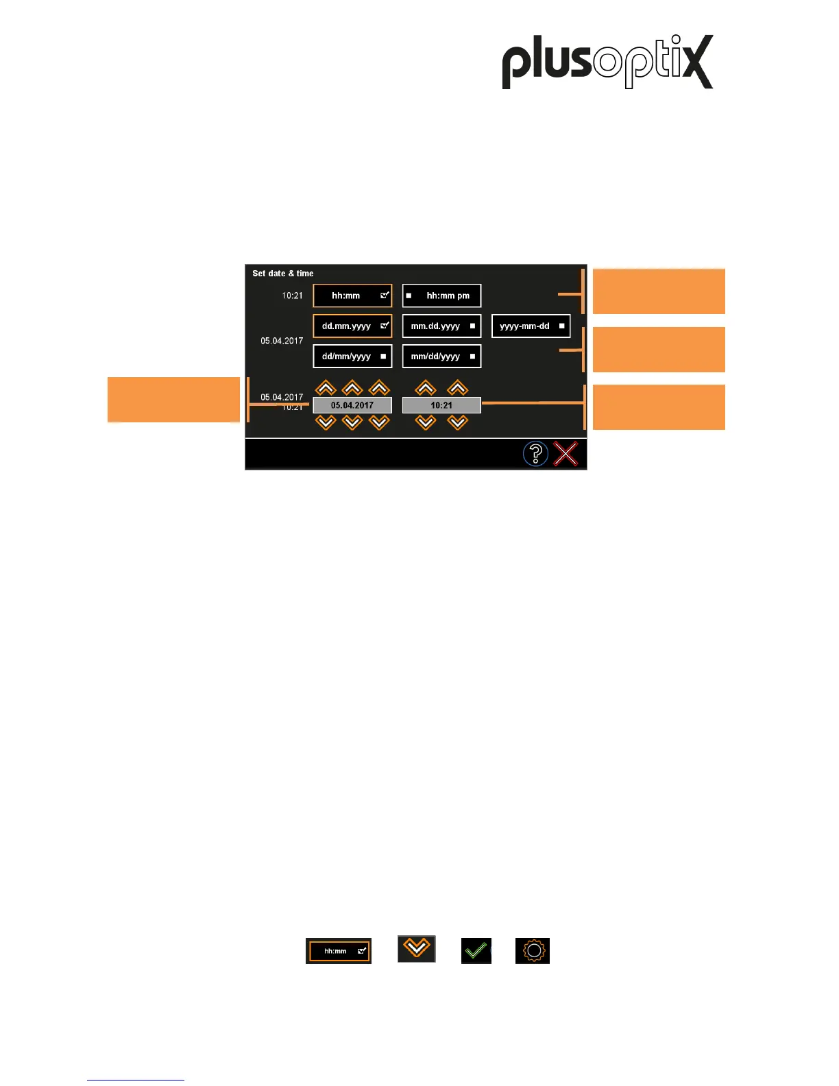 The selected time and date format is highlighted (1). Using the orange arrows (2), set the