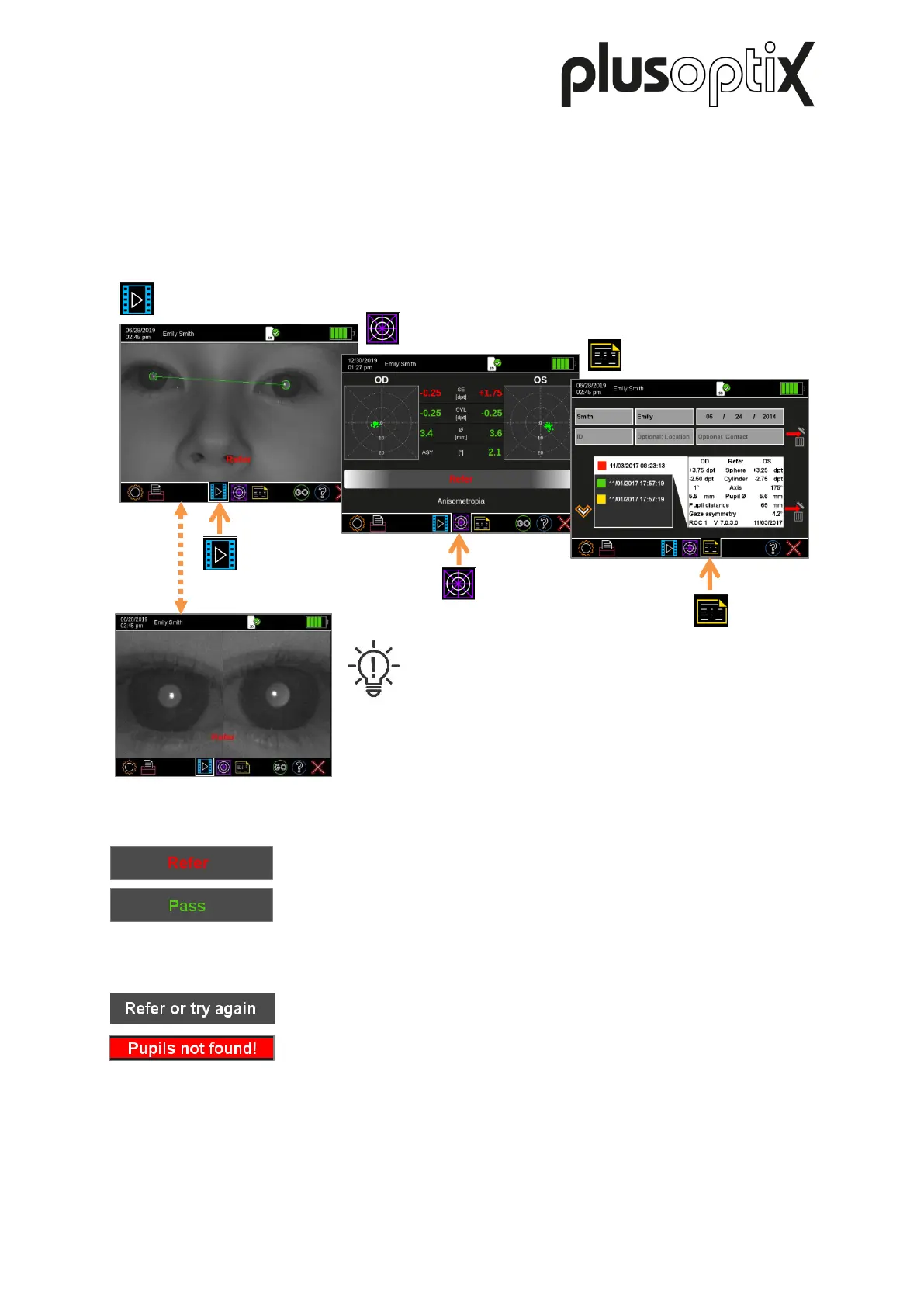 or “Pass” screening result is displayed. “Refer” is automatically
