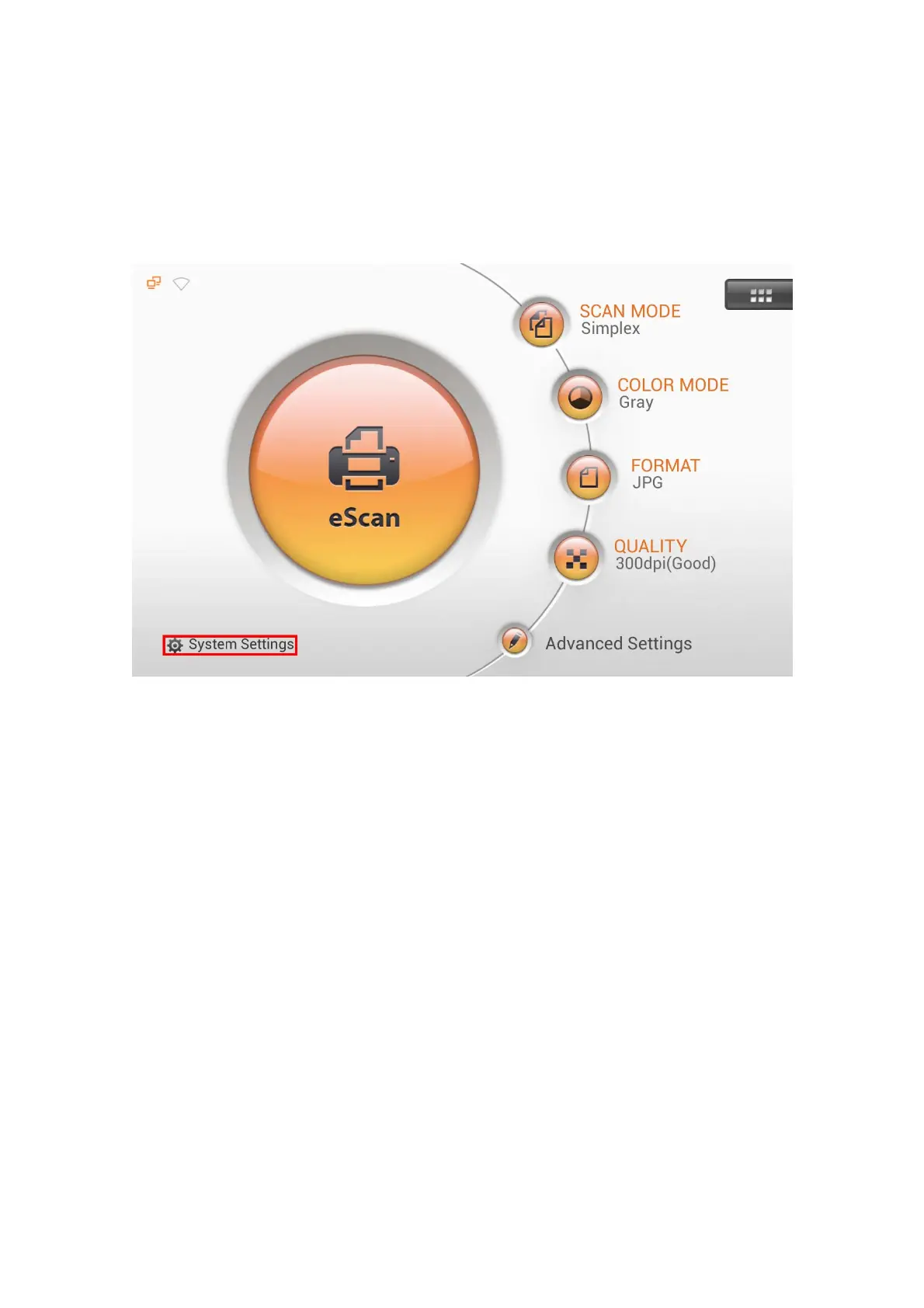 Menu to enter the System Settings interface. For example, you can configure the Wi-Fi