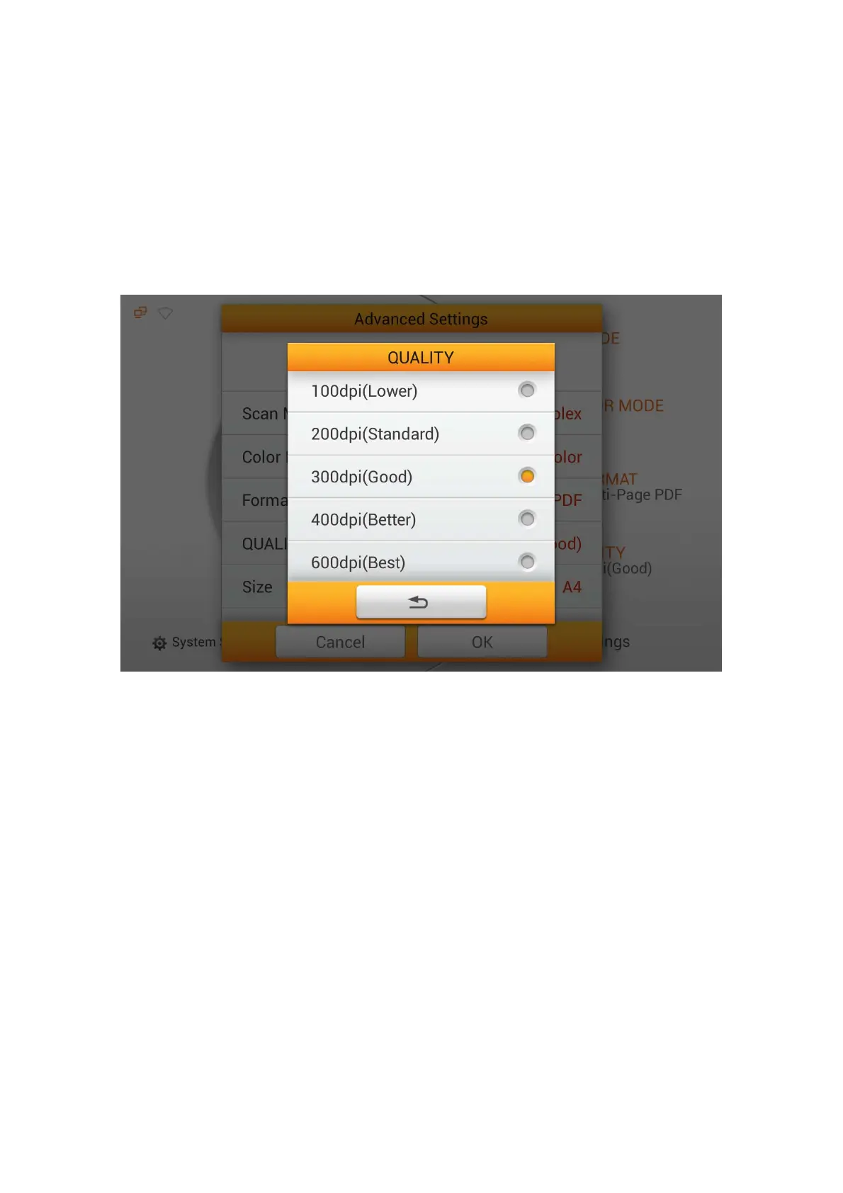 Select the desired QUALITY in the popup dialog. Available dpi values: 100dpi