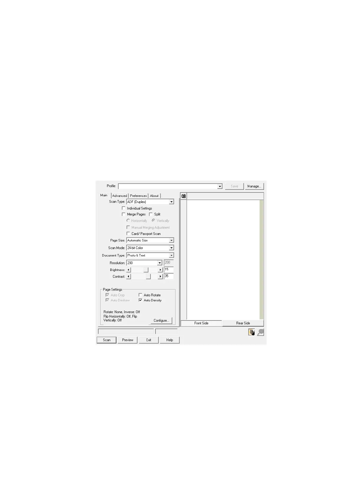 (Duplex) as Scan type and Automatic Size as Page Size to output the scan