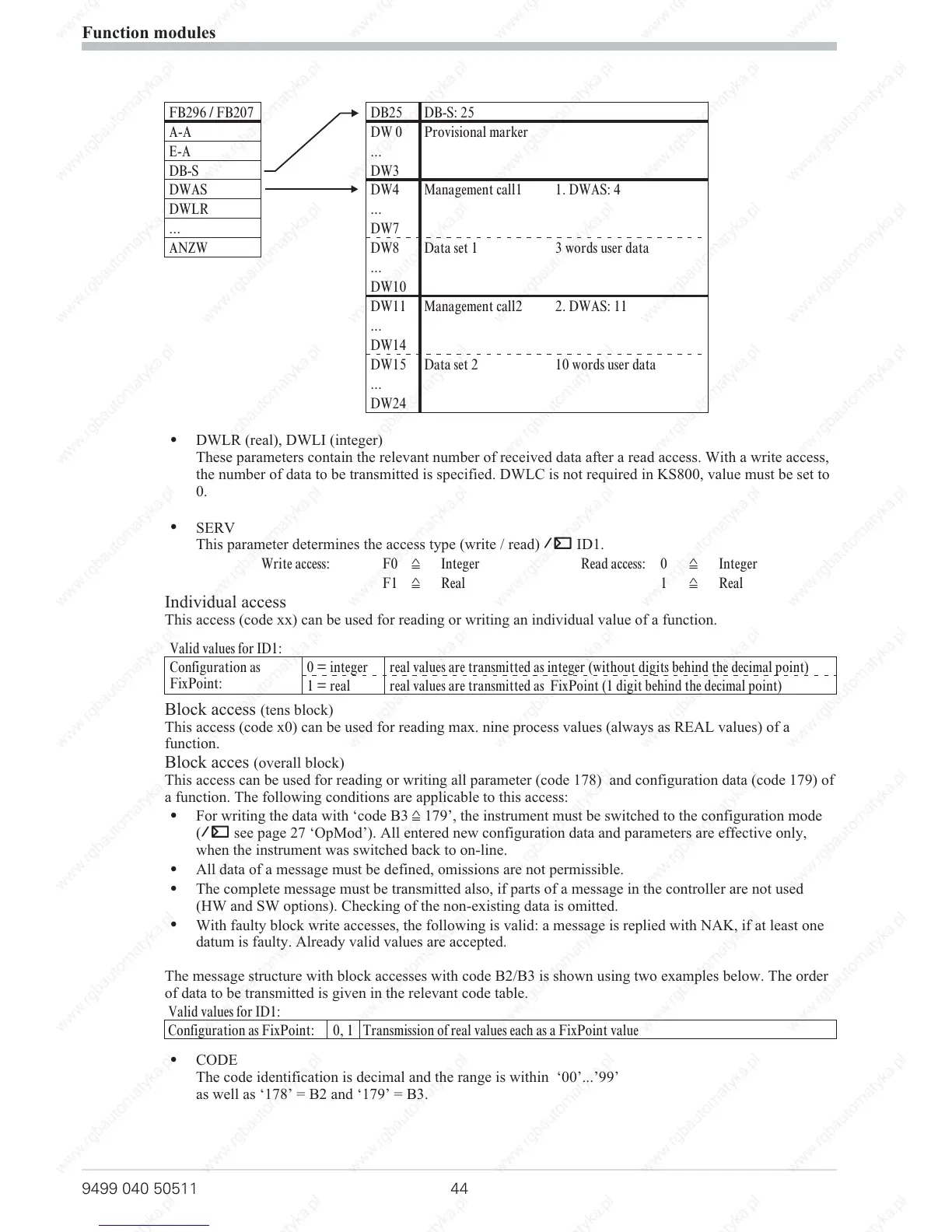 This access can be used for reading or writing all parameter (code 178) and configuration data (code 179) of