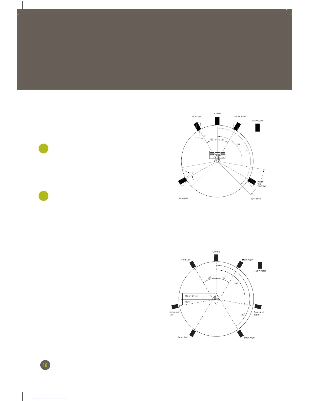 diagrams indicate the ideal speaker layouts.