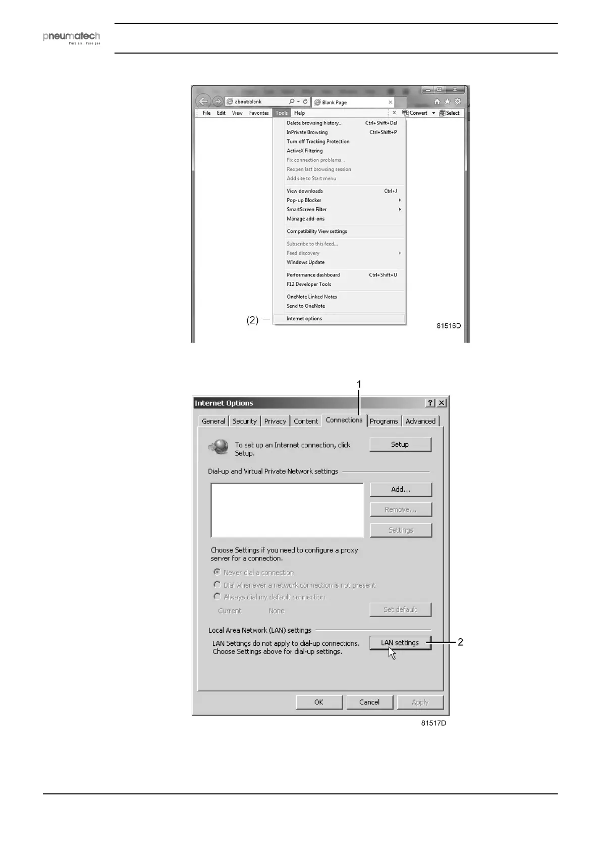 Click on the Connections tab (1) and then click on the LAN settings button (2).