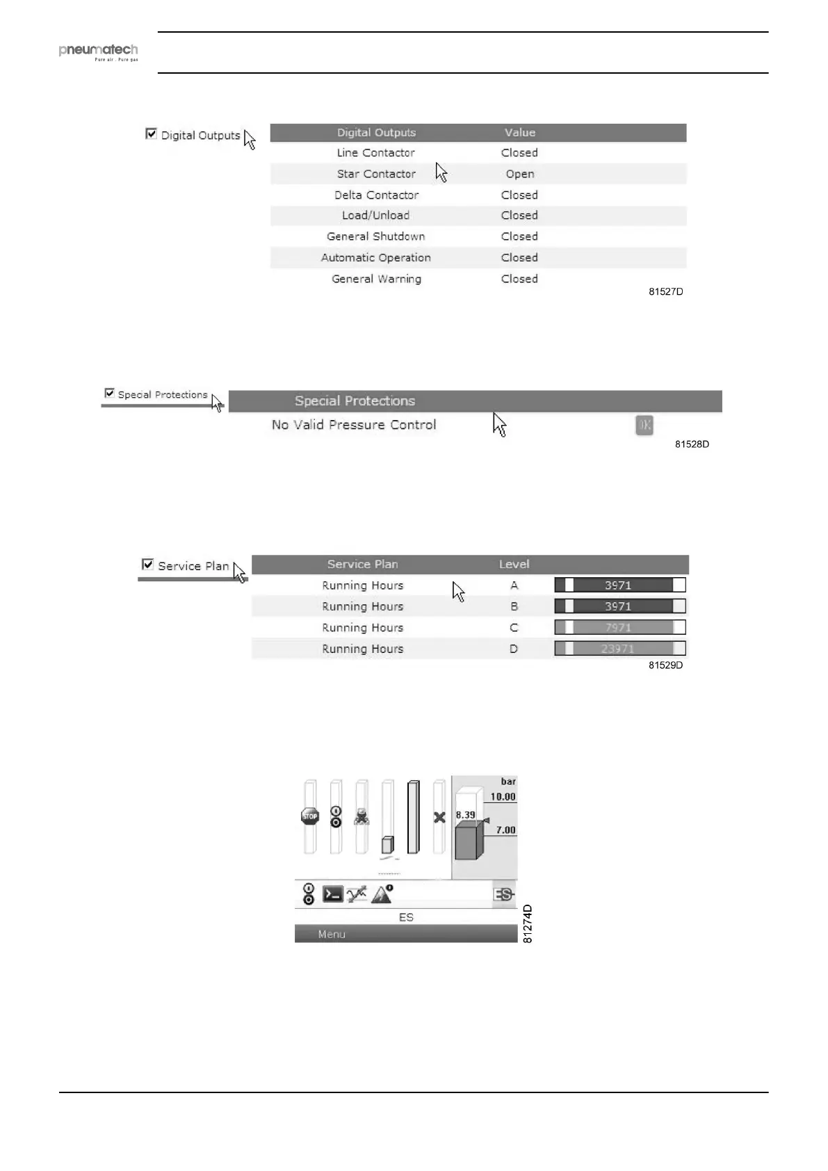 Shows all levels of the service plan and status. This screen only shows the running hours. It is