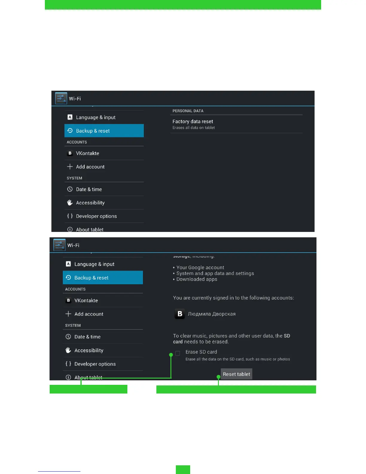 your tablet to the factory settings and erase all your personal informa-