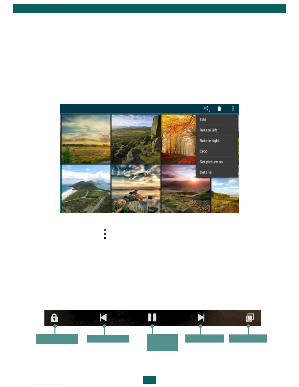 From Gallery menu you can delete, crop, set as wallpaper or contact avatar,