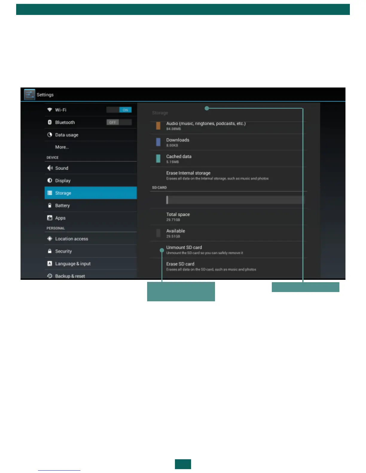 Storage section displays information about the Device storage (internal and