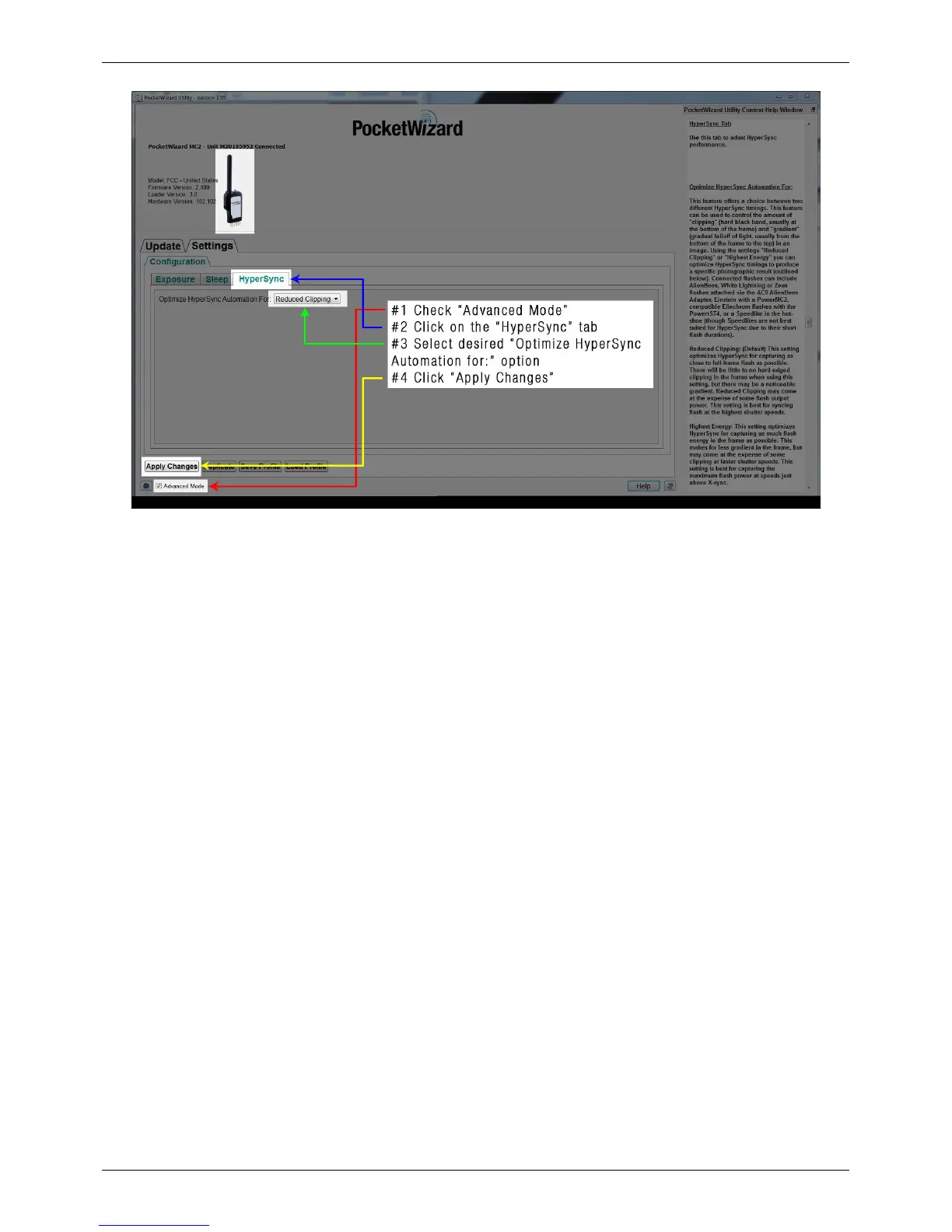 1. Connect your PowerST4 to the PocketWizard Utility via USB, and make sure that the “Advanced Mode” box is