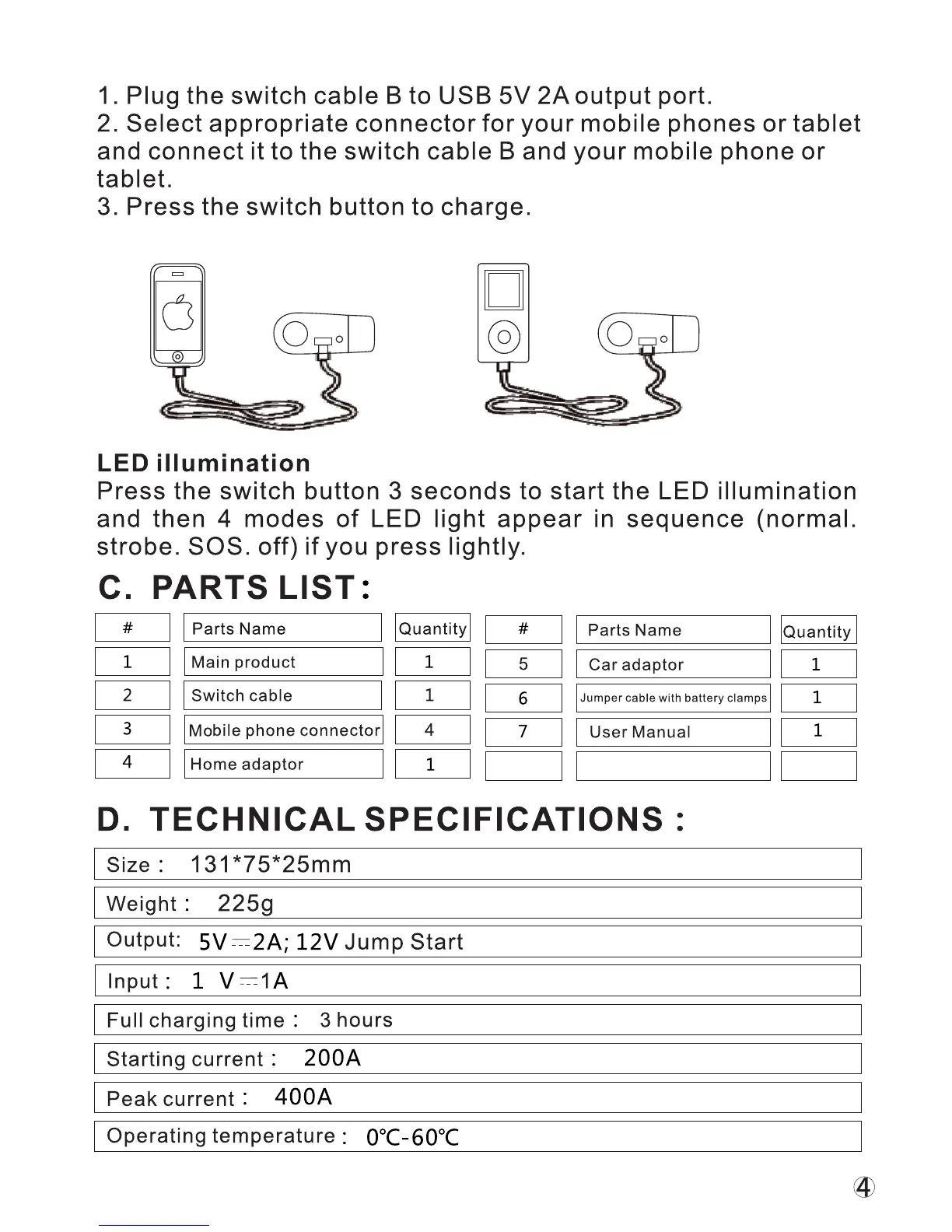 POD POD-X1 - Charging Mobile Devices; LED Illumination Modes; Product Details and Specifications; Parts List