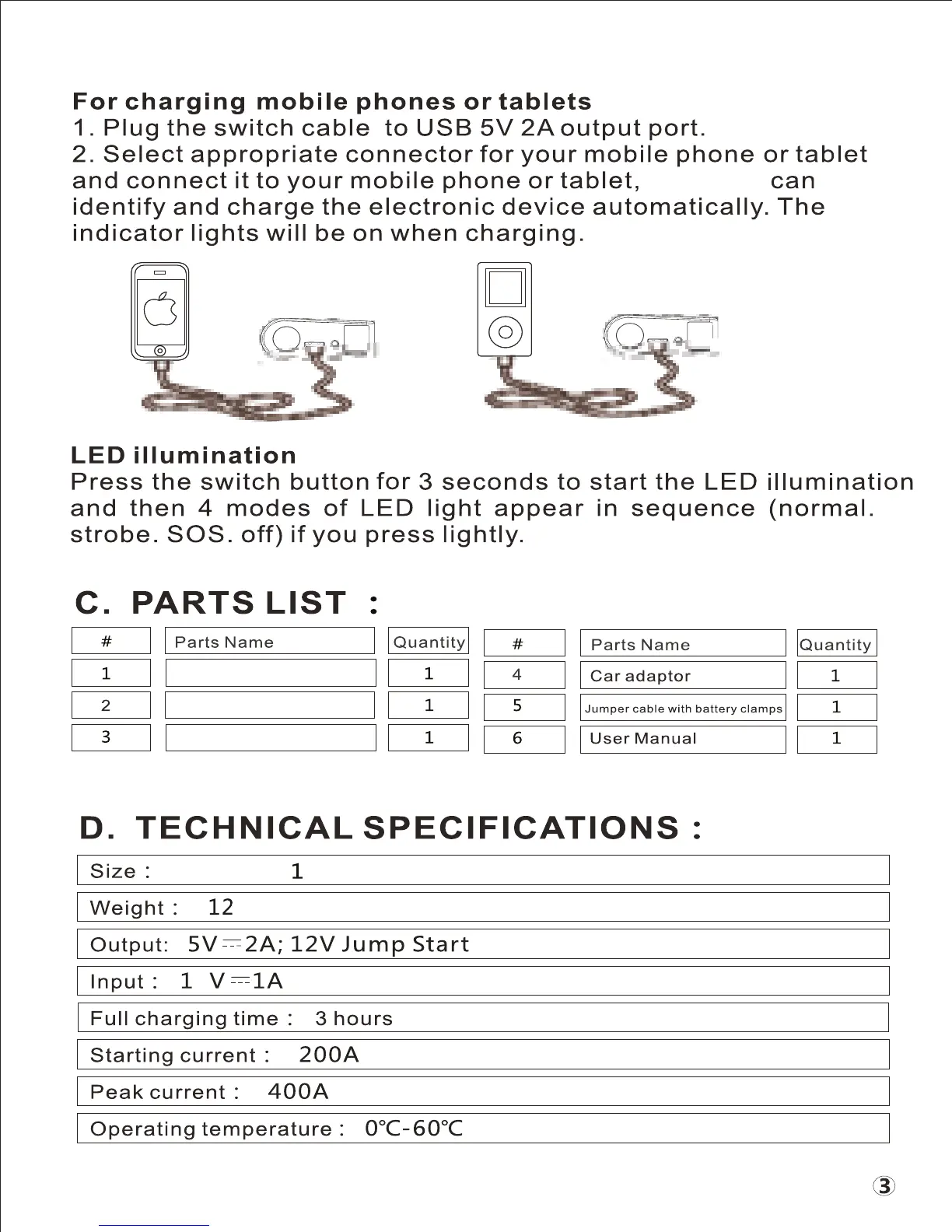 POD X3 - Charging Mobile Devices; Device Charging Instructions; LED Illumination Feature; Parts List