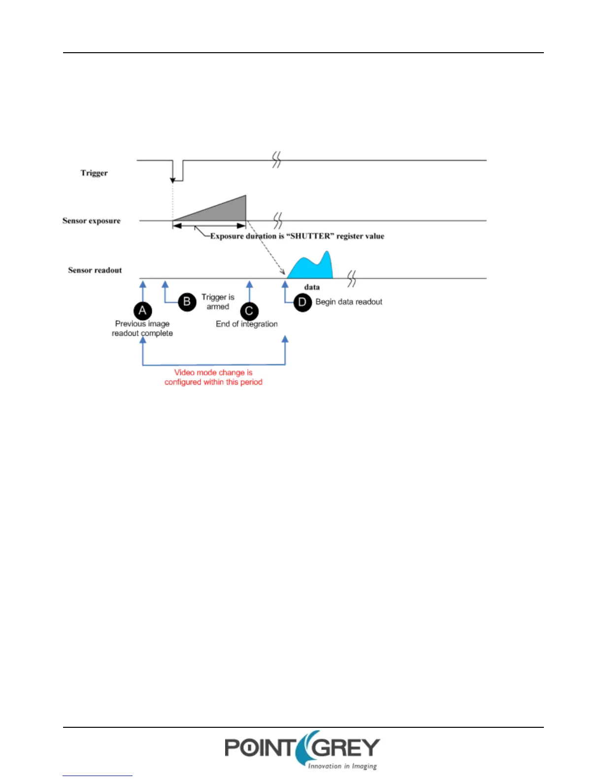 request is honored one triggered image later. In Overlapped Exposure Readout Trigger (Mode 14), point B occurs