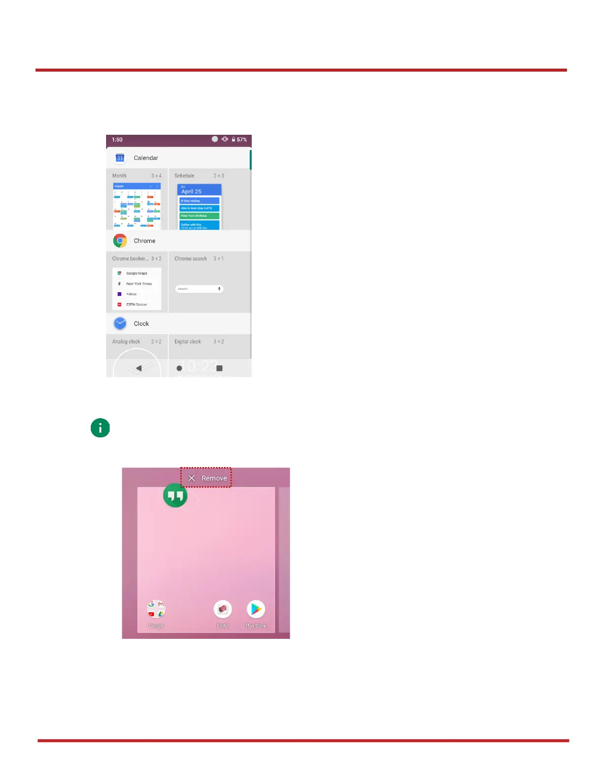 To remove an app or a widget from the Home screen, long-press and drag it to