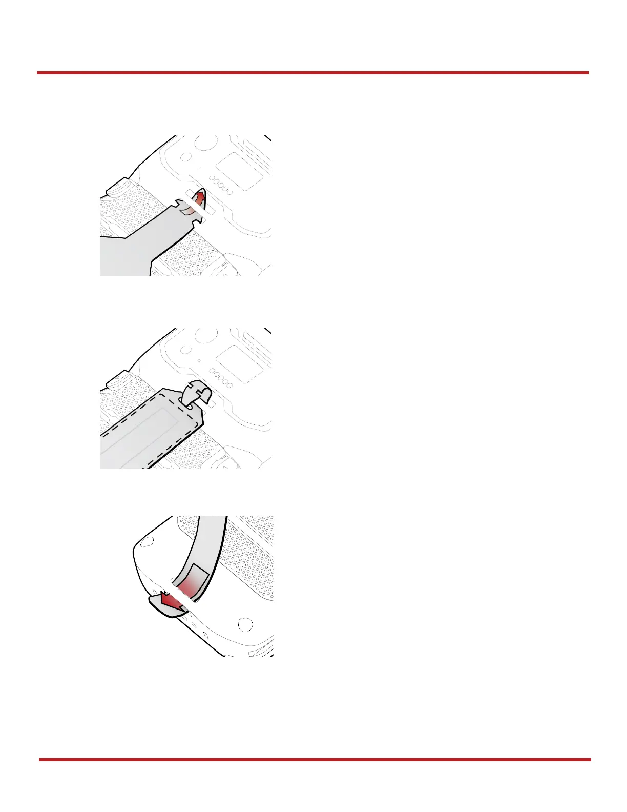 1. Using the arrow-like side of the strap through the hand strap hole.