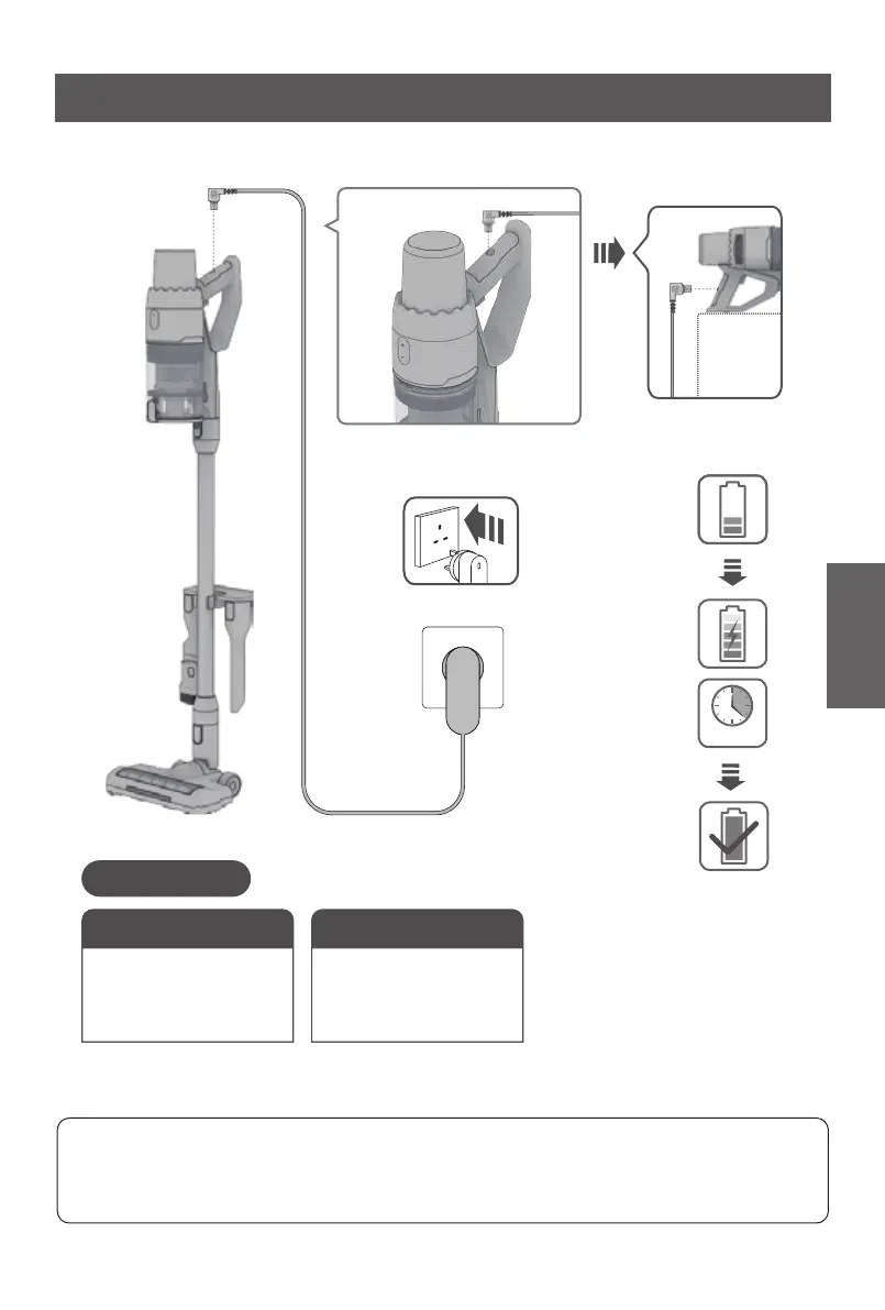 Koble adapteren til ladekontakten på håndtaket til apparatet. Når batteriet er fulladet, lyser