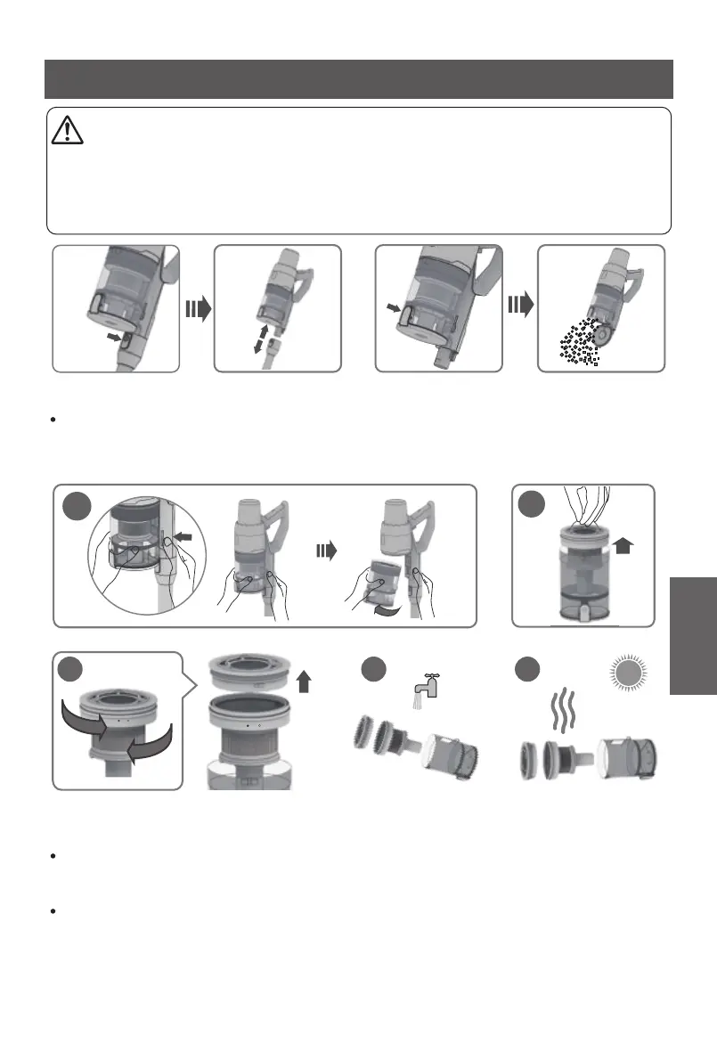 vapautuspainiketta ja huuhtele se vedellä. Huuhtele lika pois tarpeen mukaan. Kun pölysäiliö