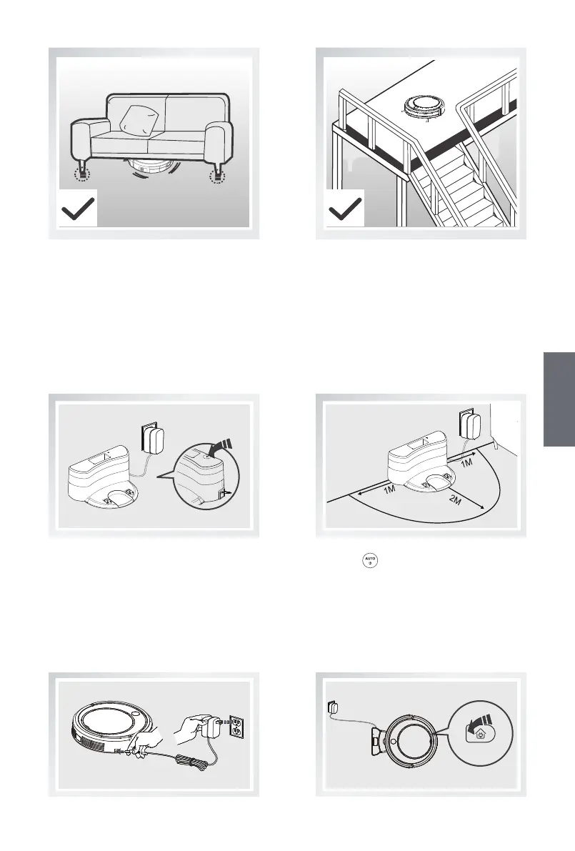 Put the charging base flatly next to the wall, and remove any obstacle on its right or left sides within 1