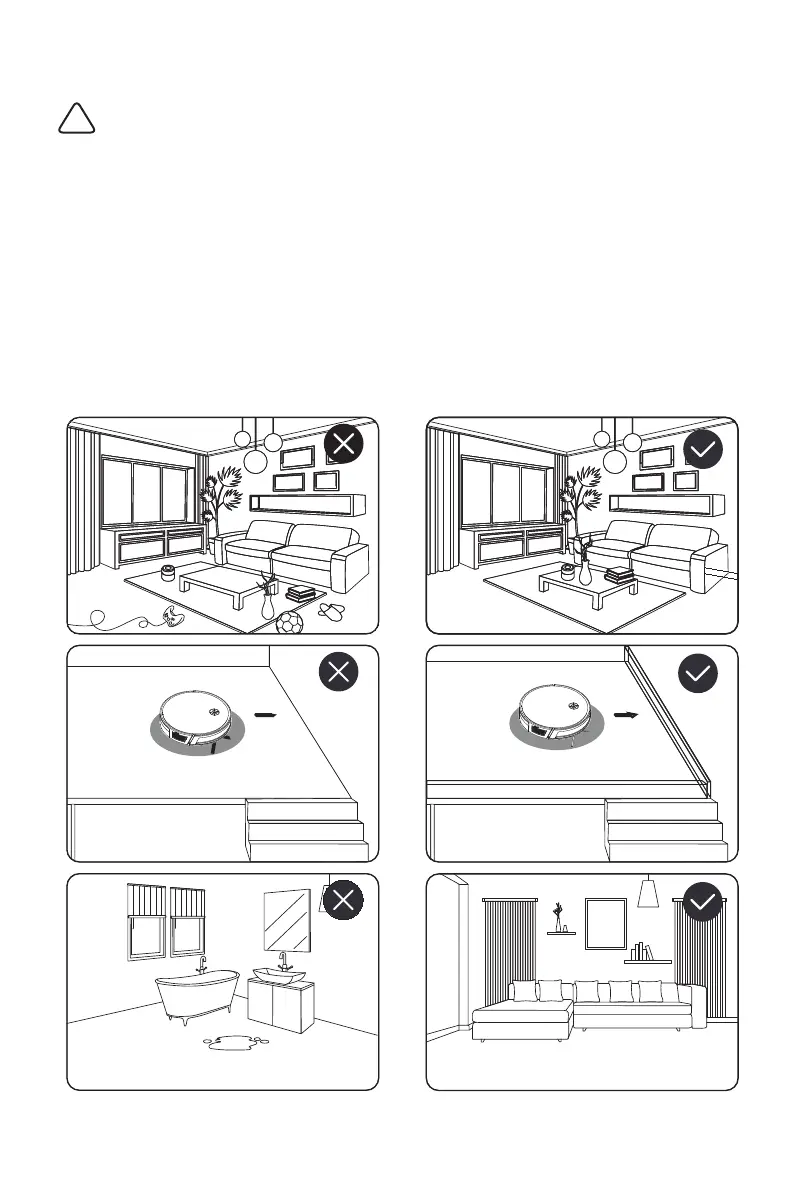 Før du bruker roboten, må du plukke opp gjenstander som klær, løst papir, snorer