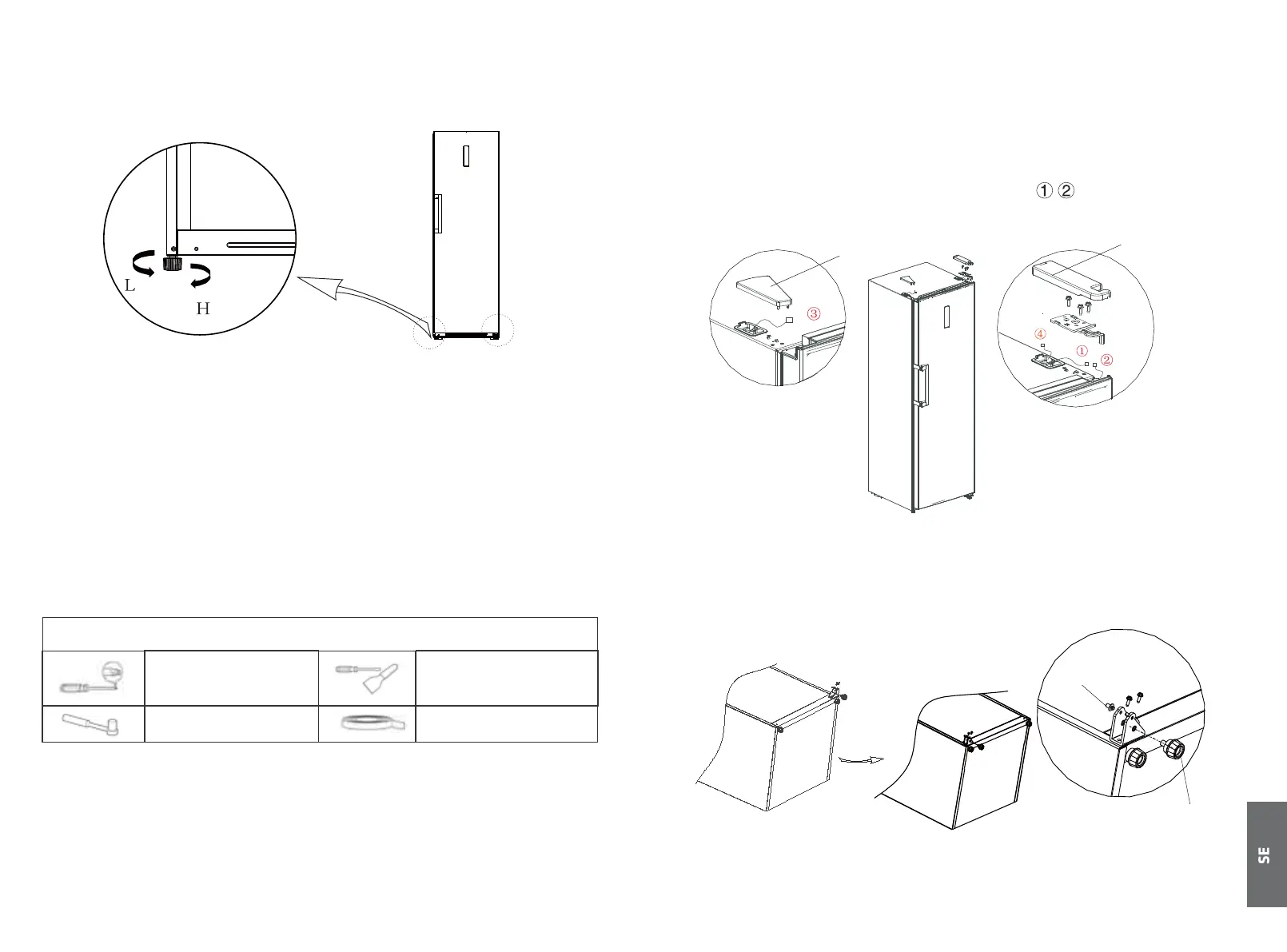 b. Vrid fötterna moturs för att sänka kylskåpet