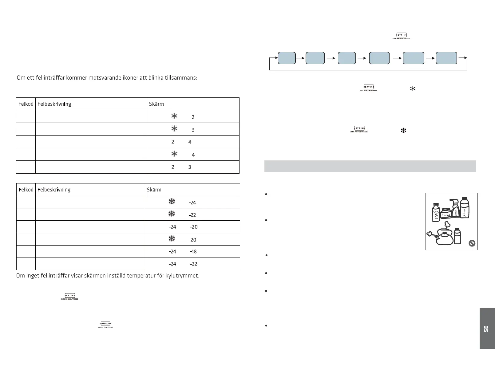 E9 Larm för hög temperatur i frys utrymmet Ikonerna "-24" och "-18" lyser samtidigt