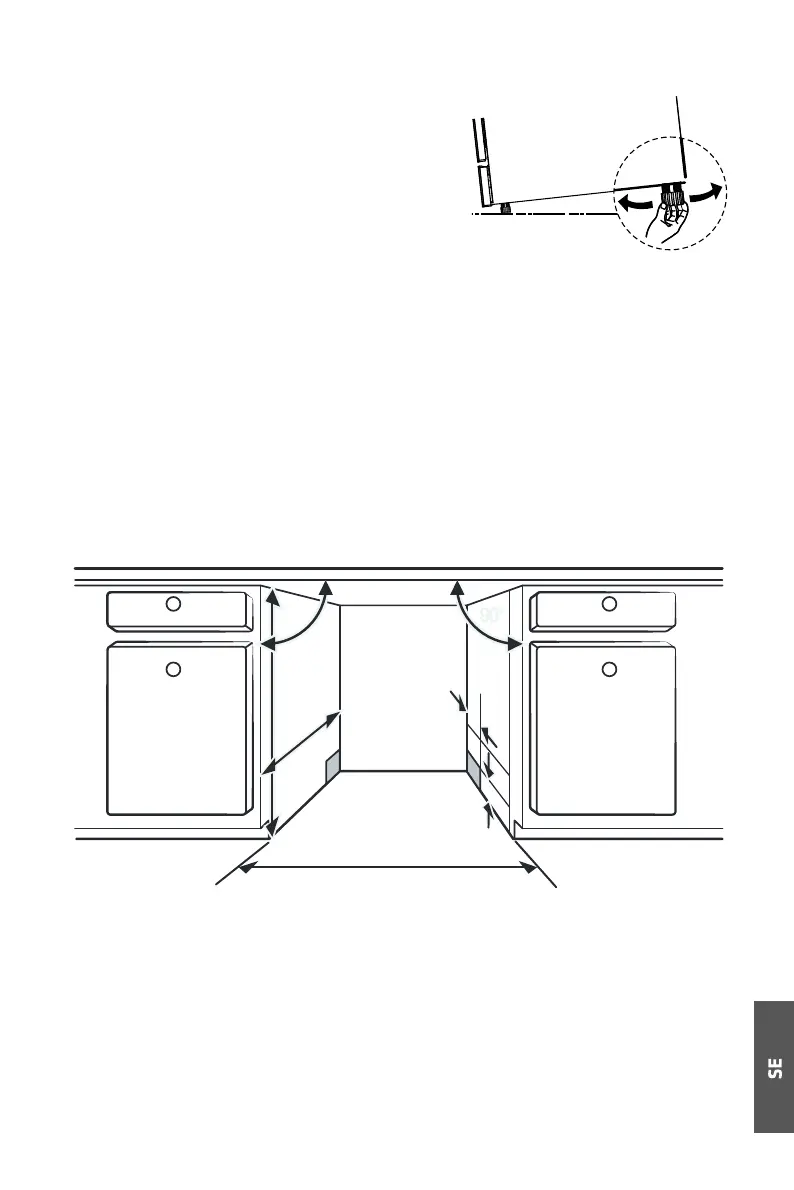 1. Mindre än 5 mm mellan diskmaskinens ovansida och skåpet, och luckans