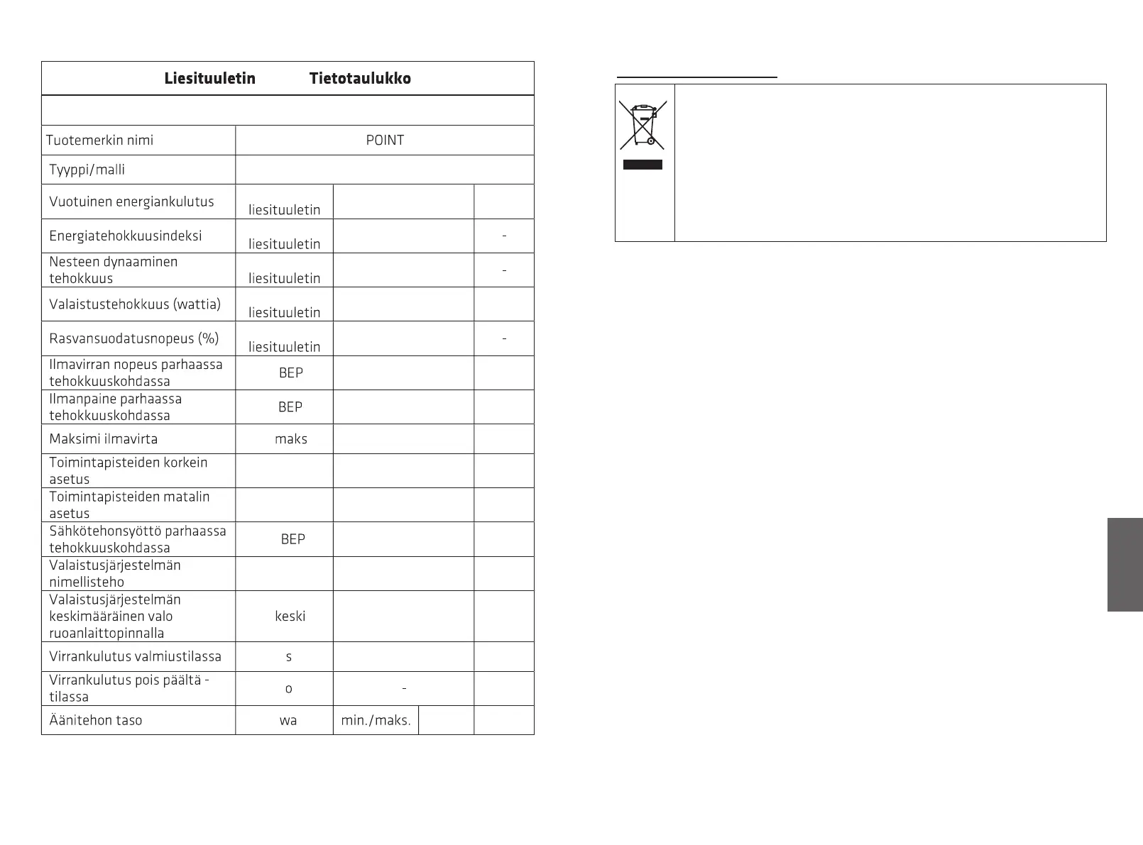 symbolilla. Tämä tarkoittaa, että tätä tuotetta ei saa hävittää