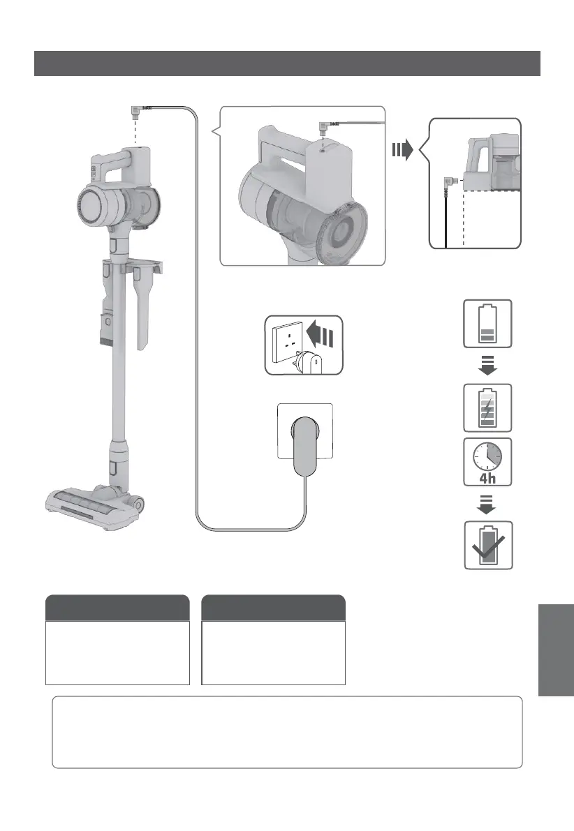Sæt adapteren i ladestikket på apparatets håndtag. Når batteriet er ladet helt