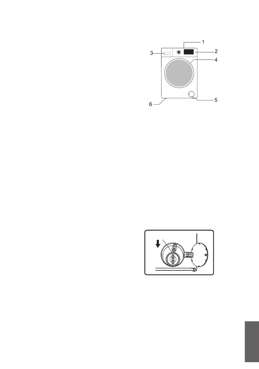 3. Användningsmetod: Öppna luckan till dräneringspumpen, dra ner låsspaken