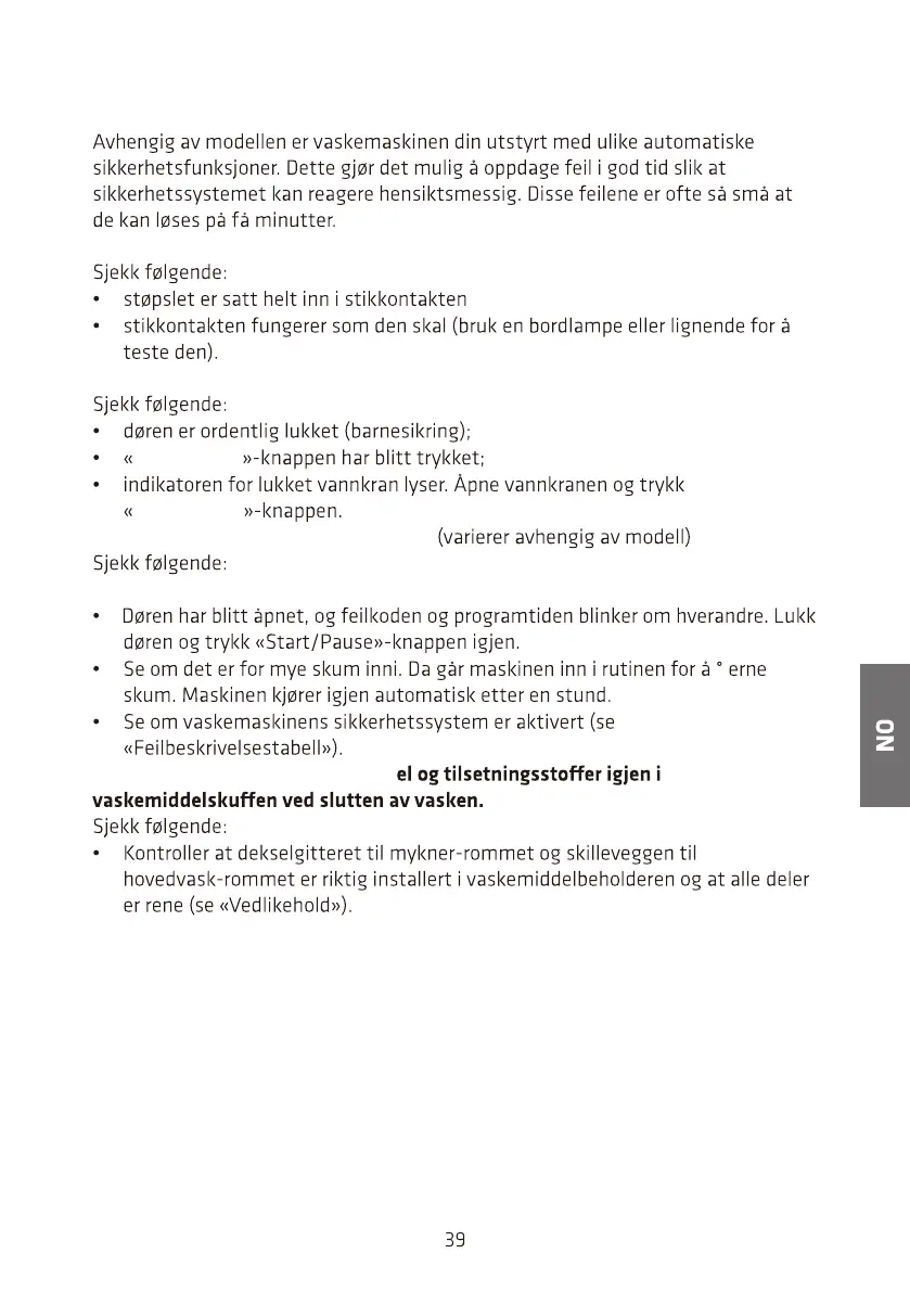 Vaskemaskinen vil ikke starte og «Start/Pause»-indikatorlampen blinker.