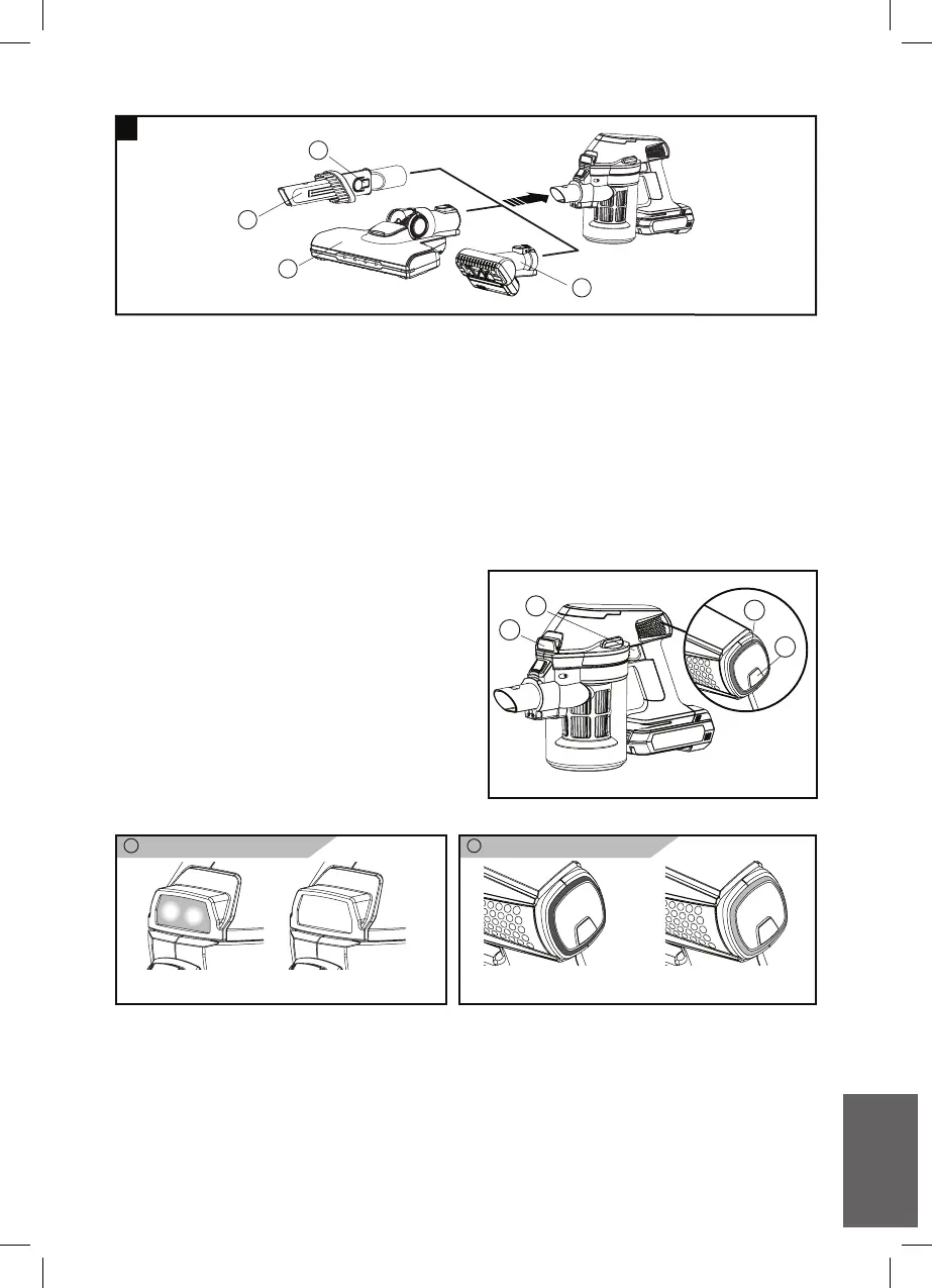 2. För att starta damsugaren, tryck en gång på PÅ/AV-knappen (G).