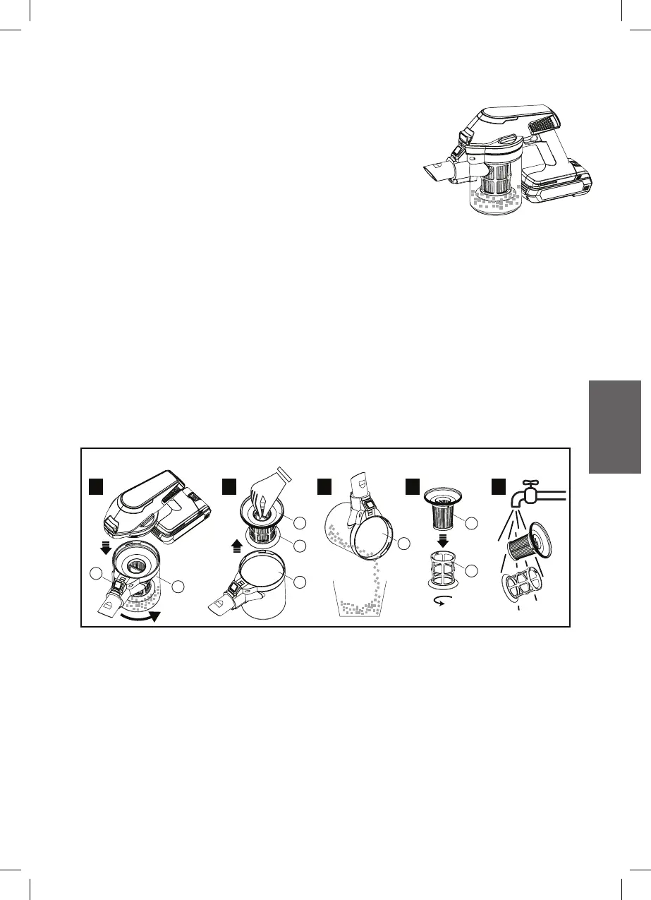 2. Pull up the Filter ( E & F ) from the Dust container (D).