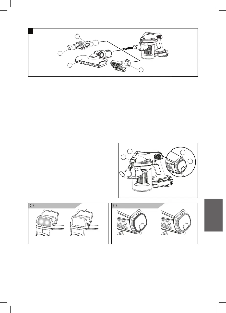 2. Kytkeäksesi pölynimurin päälle, paina PÄÄLLE/POIS-kytkintä (G)
