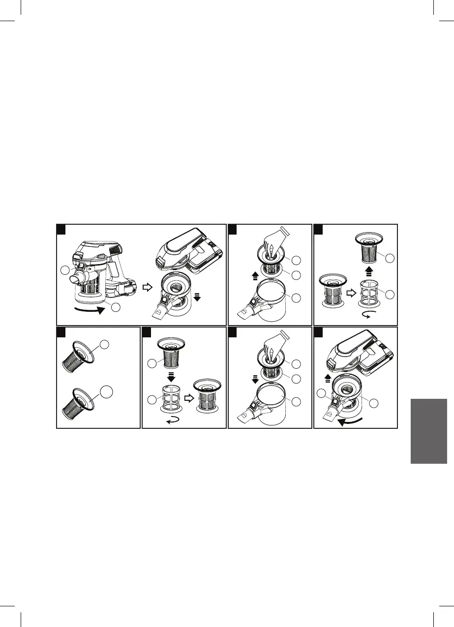 7. Asenna Pölysäiliö (D) takaisin paikalleen myötäpäivään kiertämällä.