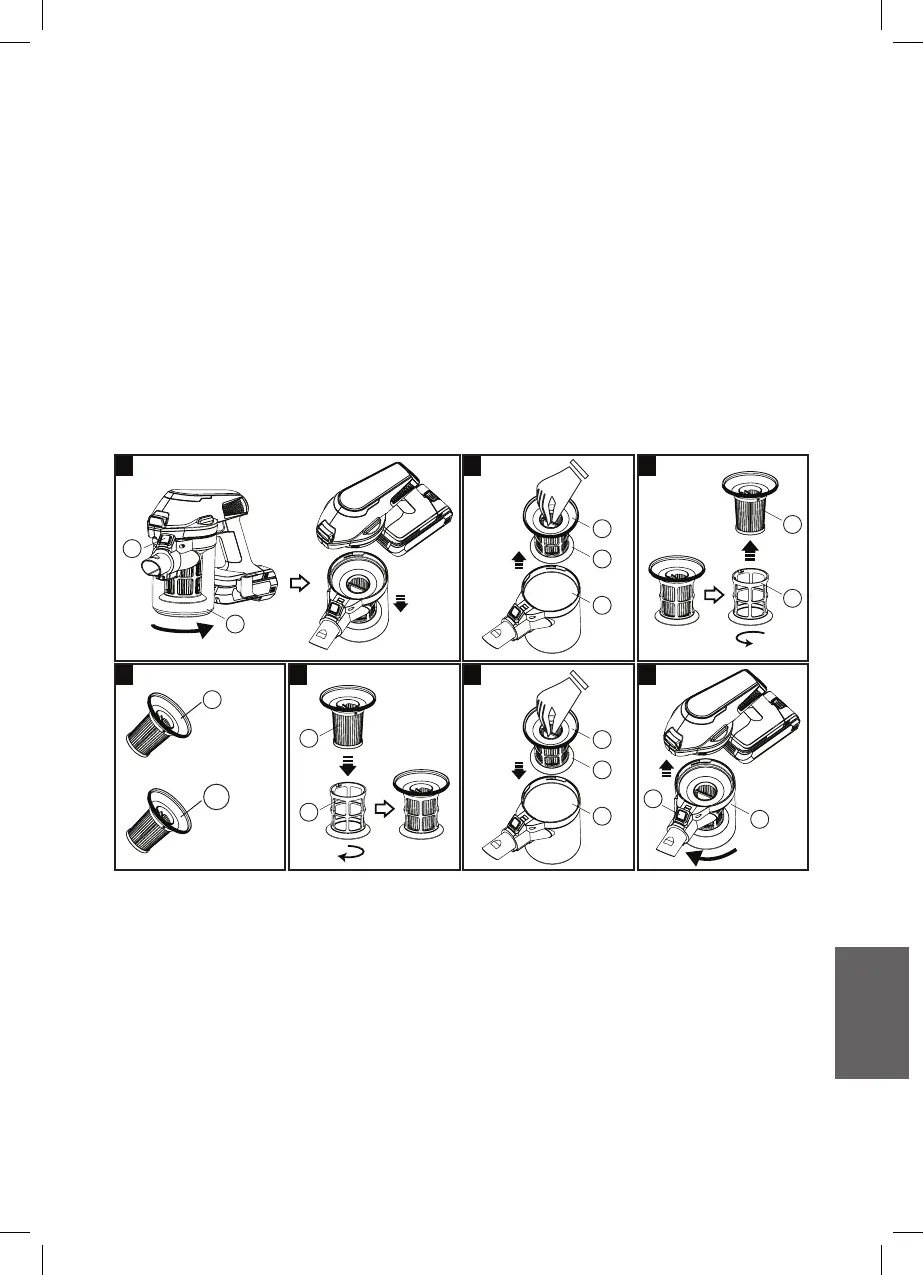 7. Sæt Støvbeholderen (D) i igen, ved at dreje den med uret.