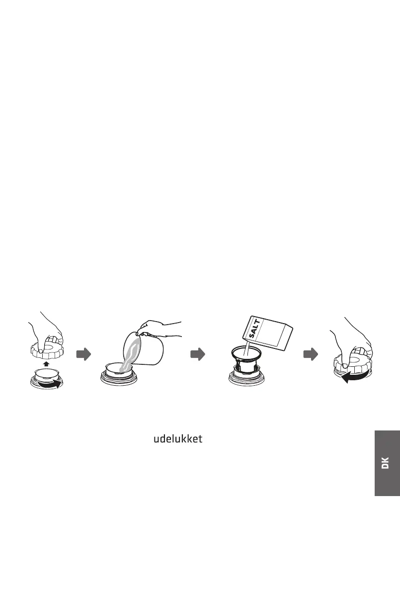 F. Umiddelbart efter påfyldning af saltet i saltbeholderen, skal et