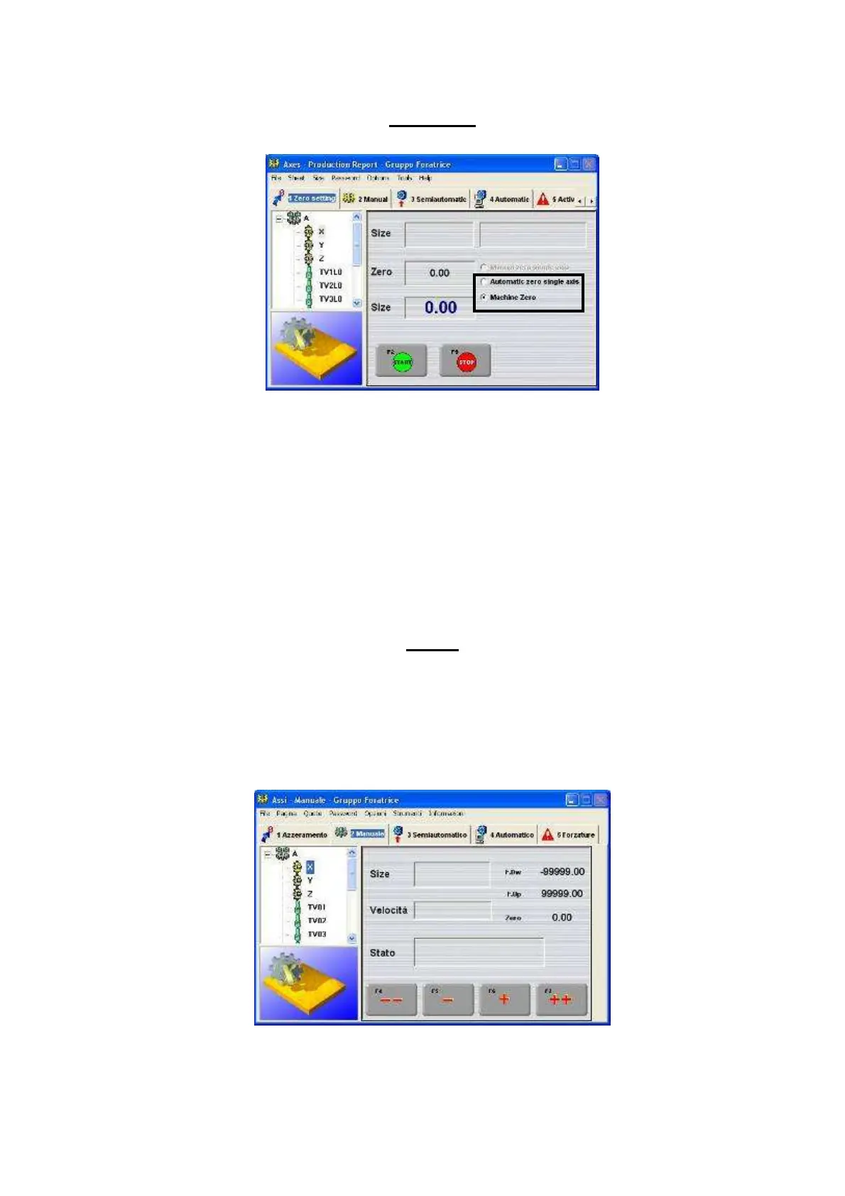 In this section it is possible to move the single machine axes by following the procedure here-