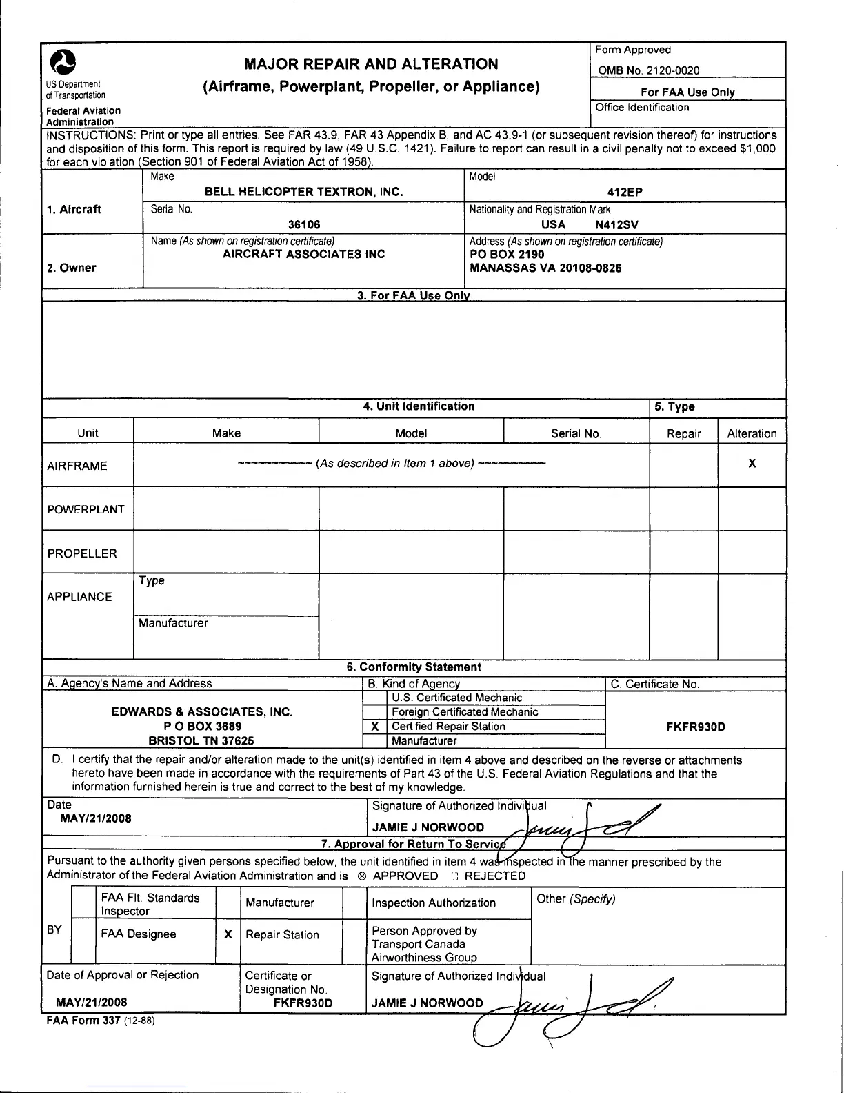 INSTRUCTIONS: Print or type all entries. See FAR 43.9, FAR 43 Appendix B, and AC 43.9-1 (or subsequent revision thereof) for instructions