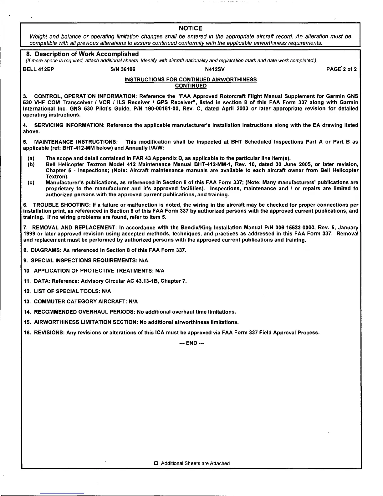 530 VHF COM Transceiver I VOR I ILS Receiver I GPS Receiver", listed in section 8 of this FAA Form 337 along with Garmin