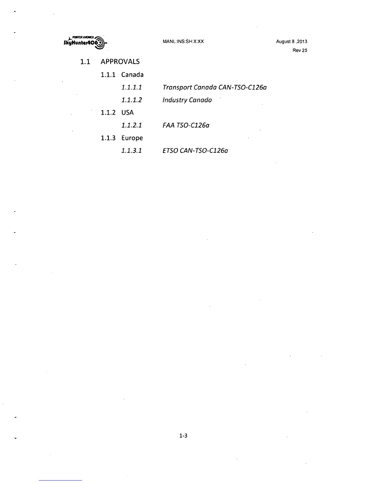Pointer Avionics skyhunter 406 - Approvals; Canada; Europe; Usa