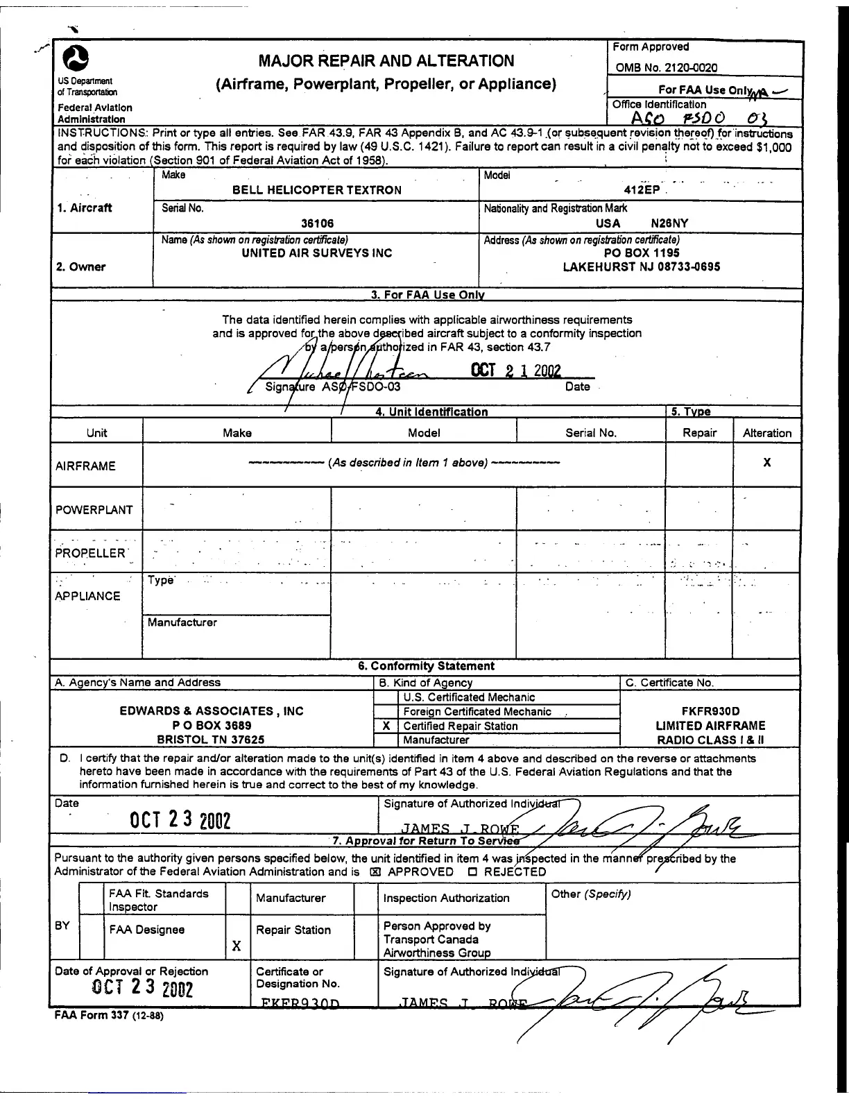 INSTRUCTIONS.: Print or type all entries. See FAR 43.9, FAR 43 Appendix B, and AC 43.9-1 _(or ~ubi.~quent revision tt,ere~f) __ ~orinstructions