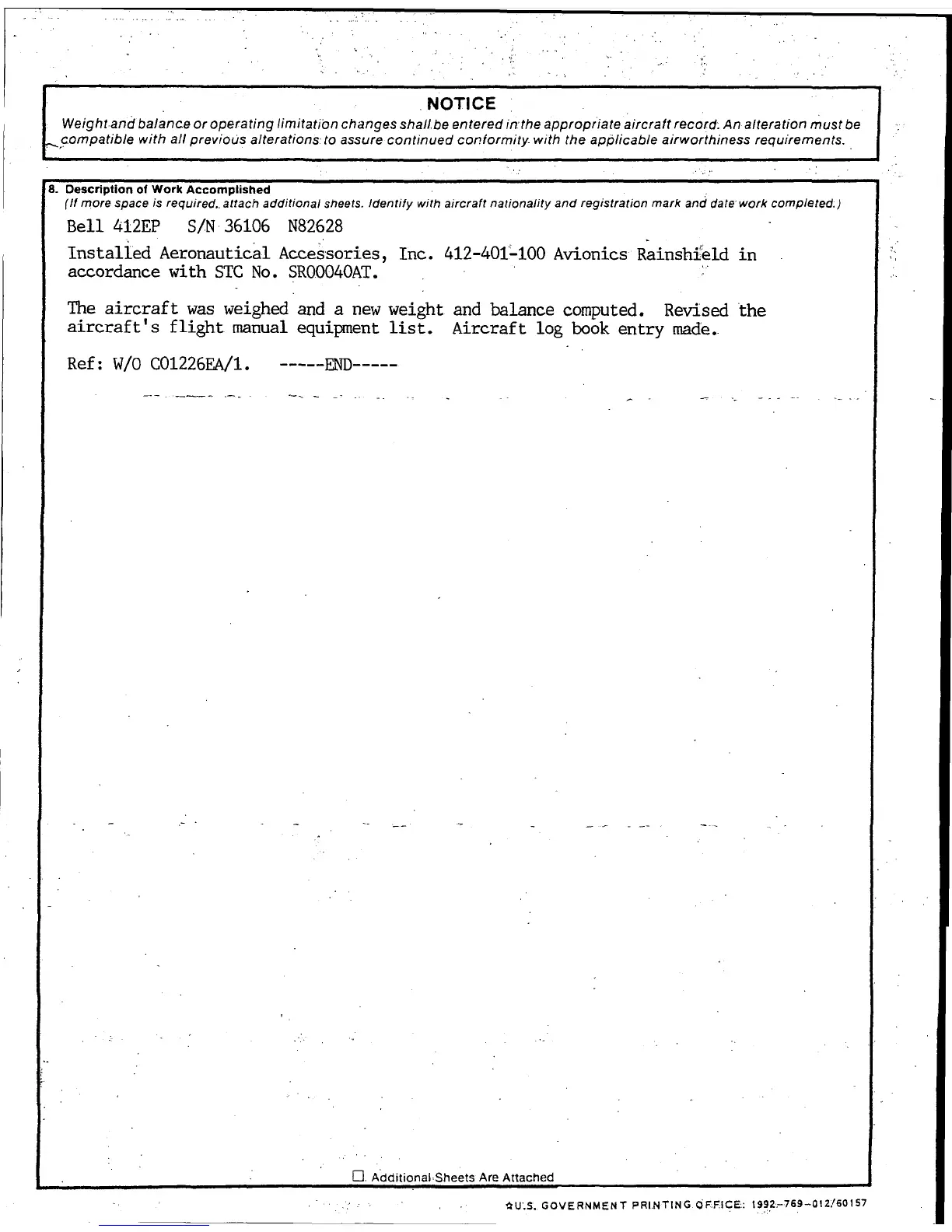 ( If more space is required .. attach additional sheets. Identify with aircraft nationality and registration mark and date work completed.)
