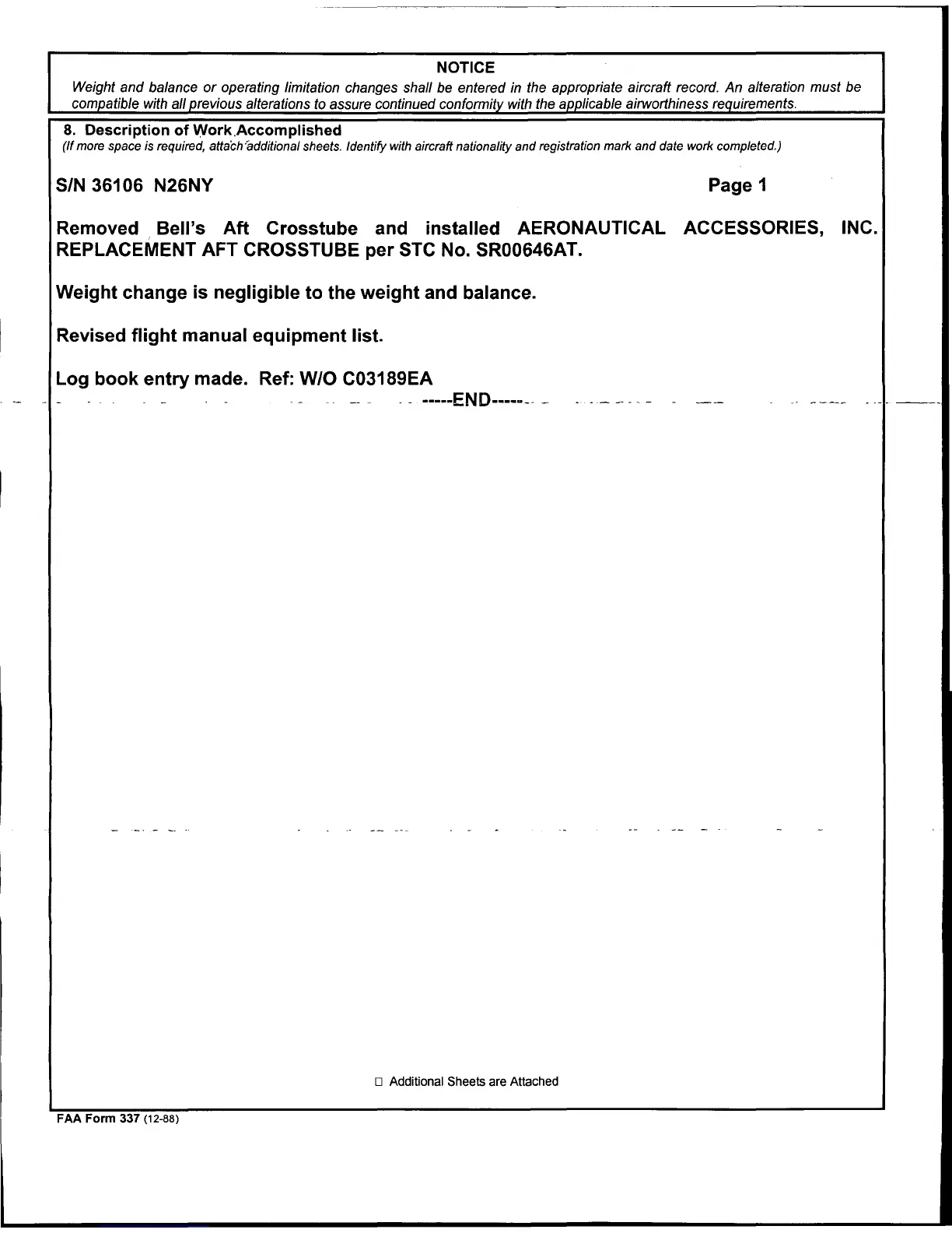 Removed Bell's Aft Crosstube and installed AERONAUTICAL ACCESSORIES, INC.