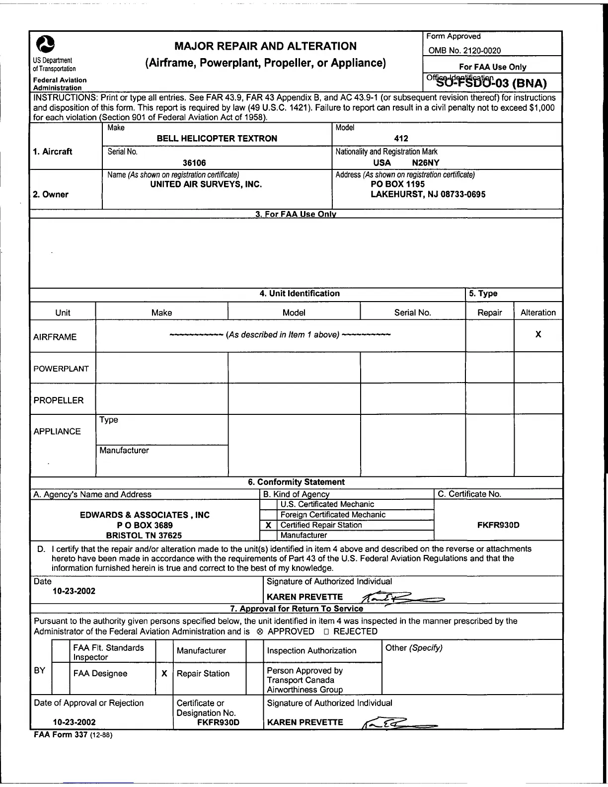 INSTRUCTIONS: Print or type all entries. See FAR 43.9, FAR 43 Appendix B, and AC 43.9-1 (or subsequent revision thereof) for instructions