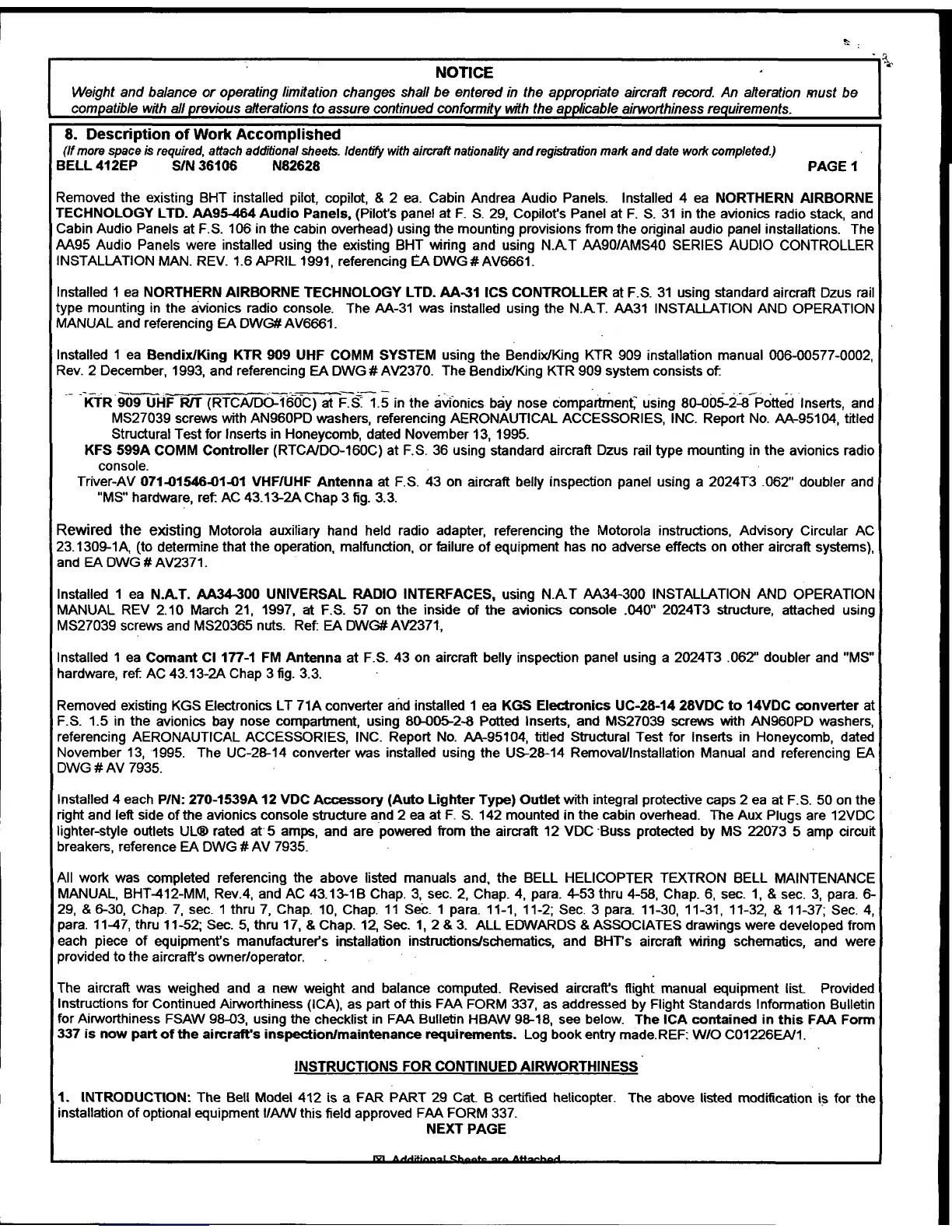 1. INTRODUCTION: The Bell Model 412 is a FAR PART 29 Cat. B certified helicopter. The above listed modification