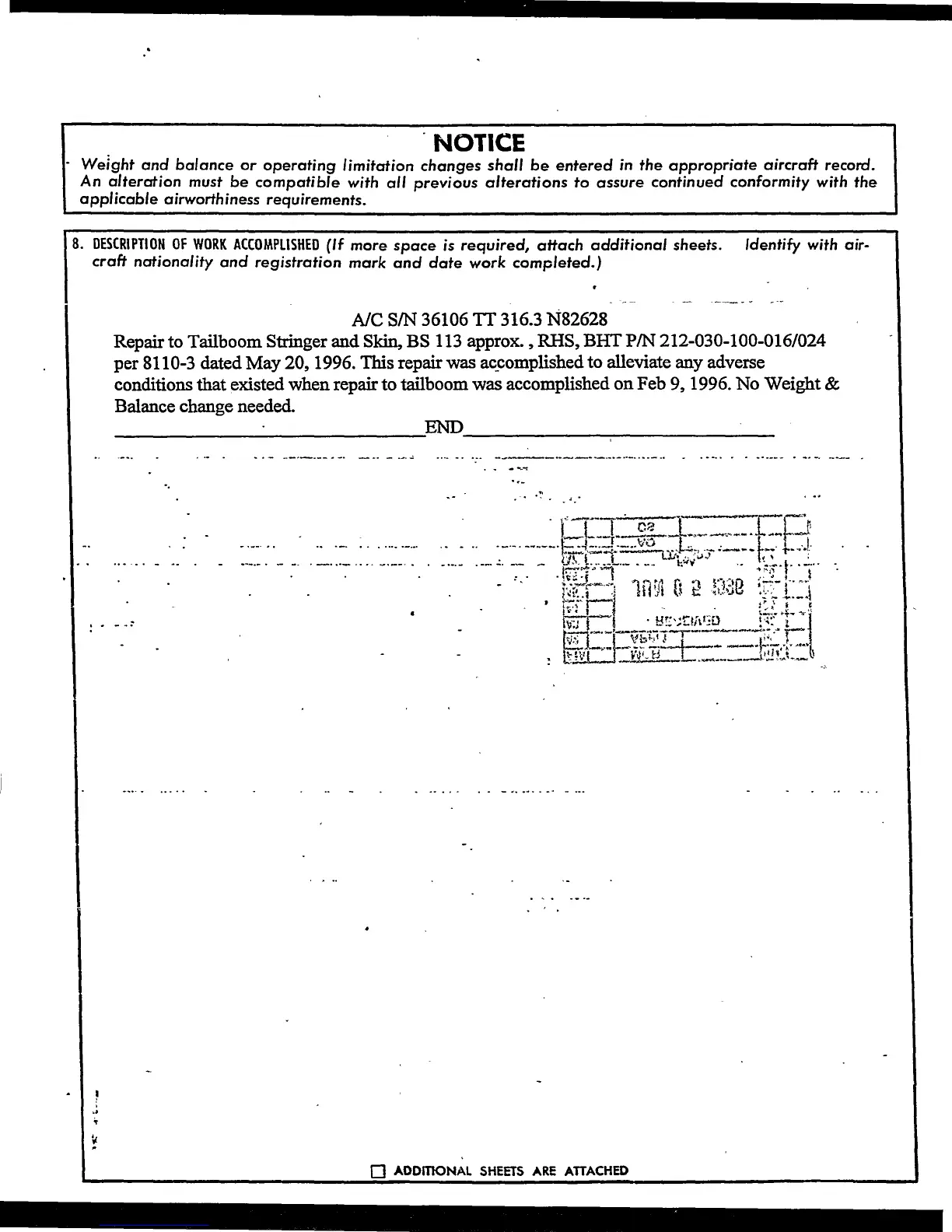 conditions that existed when repair to tailboom was accomplished on Feb 9, 1996. No Weight