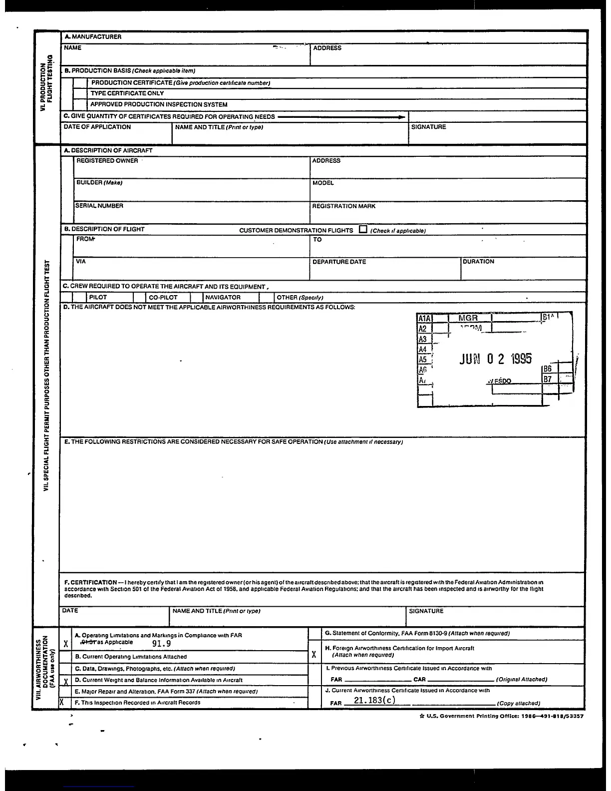 with Section 501 of the Federal Aviation Act of 1958, and applicable Federal Aviation Regulations: and that the aircraft has been inspected and ,s a1rwonhy for the fhght
